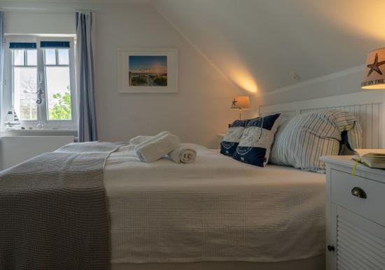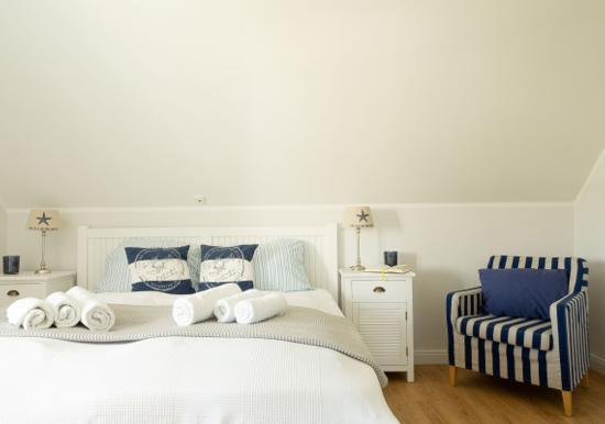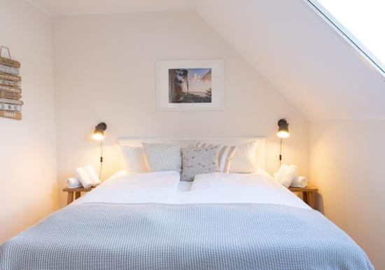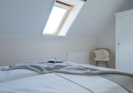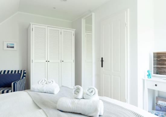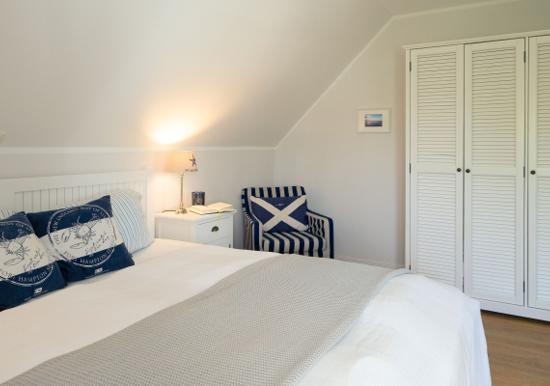 Über eine Wendeltreppe gelangen Sie in das Obergeschoss. Hier befindet sich das Schlafzimmer, ausgestattet mit einem komfortablen Doppelbett, einem geräumigen Kleiderschrank sowie einem zusätzlichen Fernsehgerät.