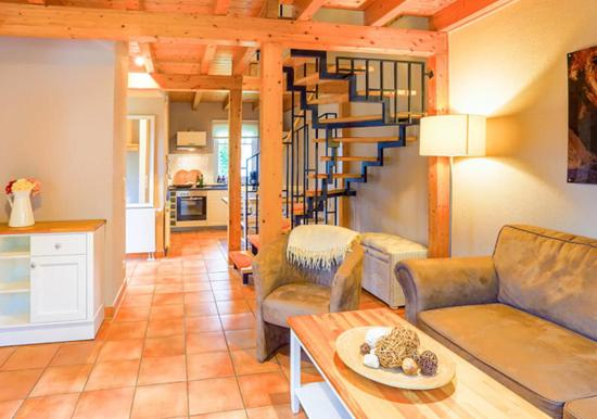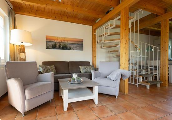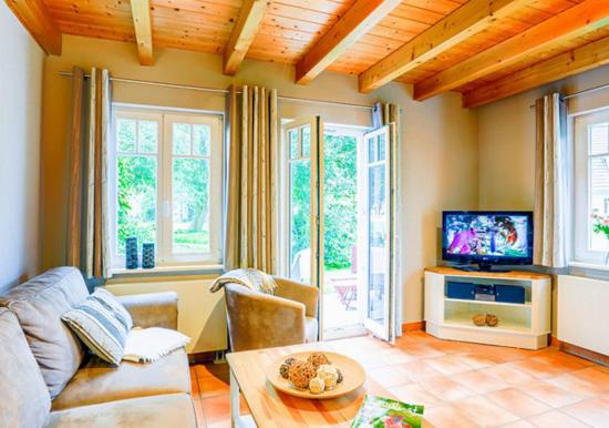 Im Erdgeschoss des Hauses befindet sich der geschmackvoll möblierte Wohnbereich. Zwei Sessel und eine komfortable, ausziehbare Sofa-Garnitur laden am Tage zum gemütlichen Familientreffen ein. Die Sofa-Garnitur bietet 2 Personen einen Schlafplatz für die Nacht.