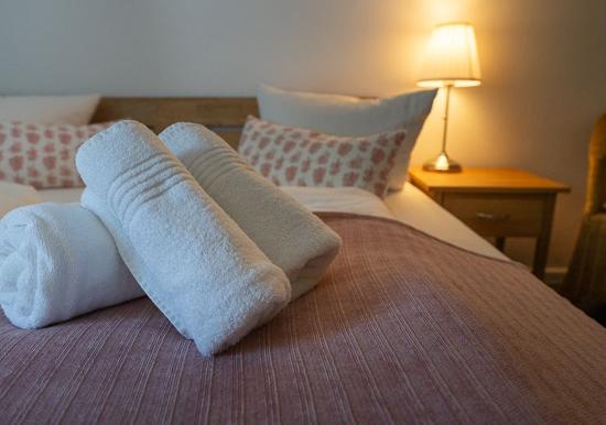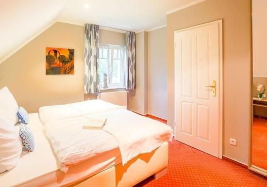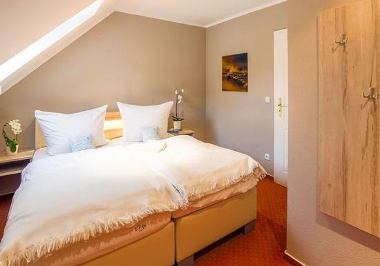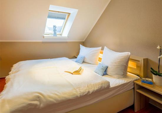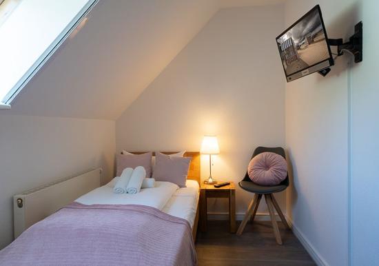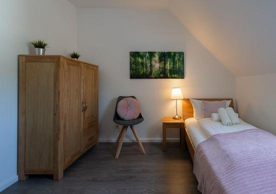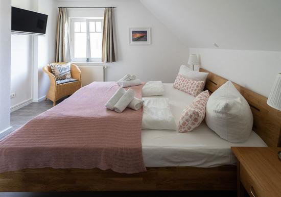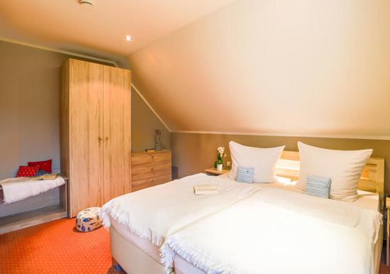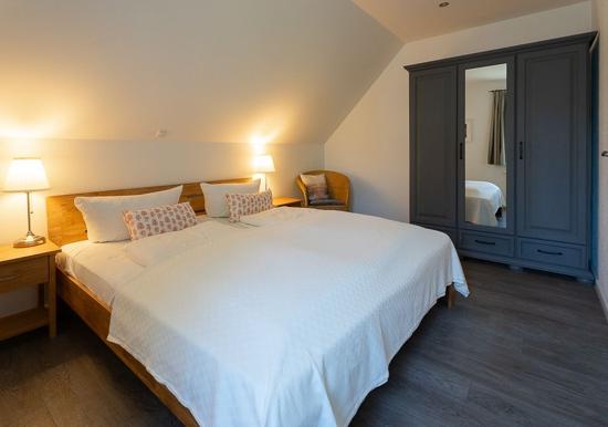 Über eine Wendeltreppe gelangen Sie in das Obergeschoss. Hier befinden sich 3 Schlafzimmer, jeweils mit einem Doppelbett und einem geräumigen Kleiderschrank ausgestattet. Je ein weiteres Fernsehgerät befindet sich in 2 Schlafzimmern.