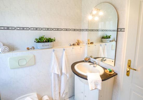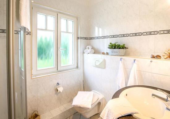 Das hochwertige Badezimmer auf dieser Ebene verfügt über eine Badewanne, ein WC sowie zwei Waschbecken mit geräumigen Unterschränken.