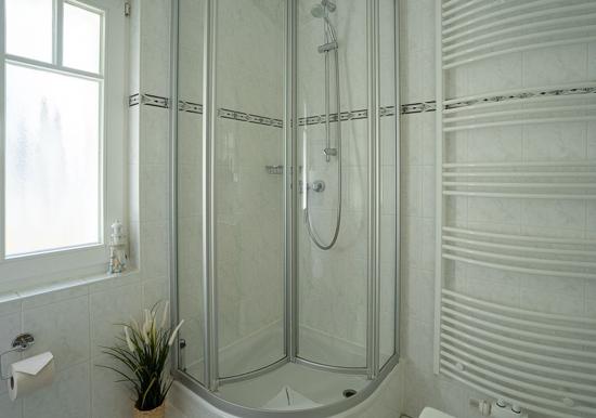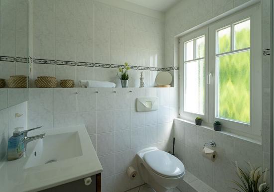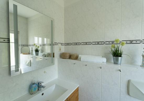 Ebenfalls im Erdgeschoss steht Ihnen eines von insgesamt 4 Schlafzimmern zur Verfügung. Dieses ist mit einem komfortablen Doppelbett eingerichtet. In diesem Bereich befindet sich ebenso ein Badezimmer mit einer Dusche, einem WC und einem Waschbecken.