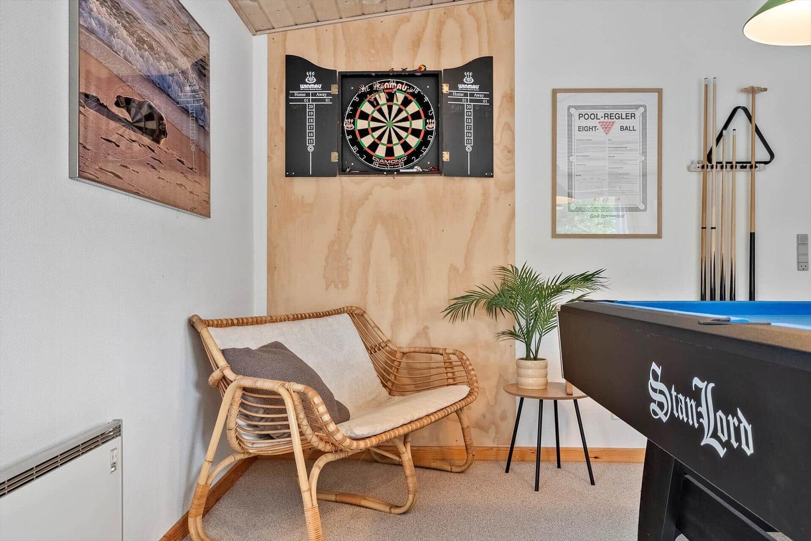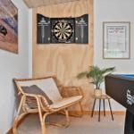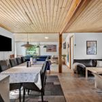In diesem liebevoll eingerichteten Holzferienhaus erwartet die Gäste ein großzügiger Wohnbereich, der Küche, Essplatz und Wohnzimmer vereint. Hier können sie beim Kochen, Lesen oder am knisternden Kaminofen relaxen und sich austauschen. Ein besonderes Highlight ist der kleine Bereich mit Billard und Darts, ideal für spannende Spiele für die ganze Familie. Die Ausstattung ist darauf ausgelegt, Gemütlichkeit und Unterhaltung zu bieten.