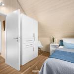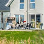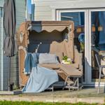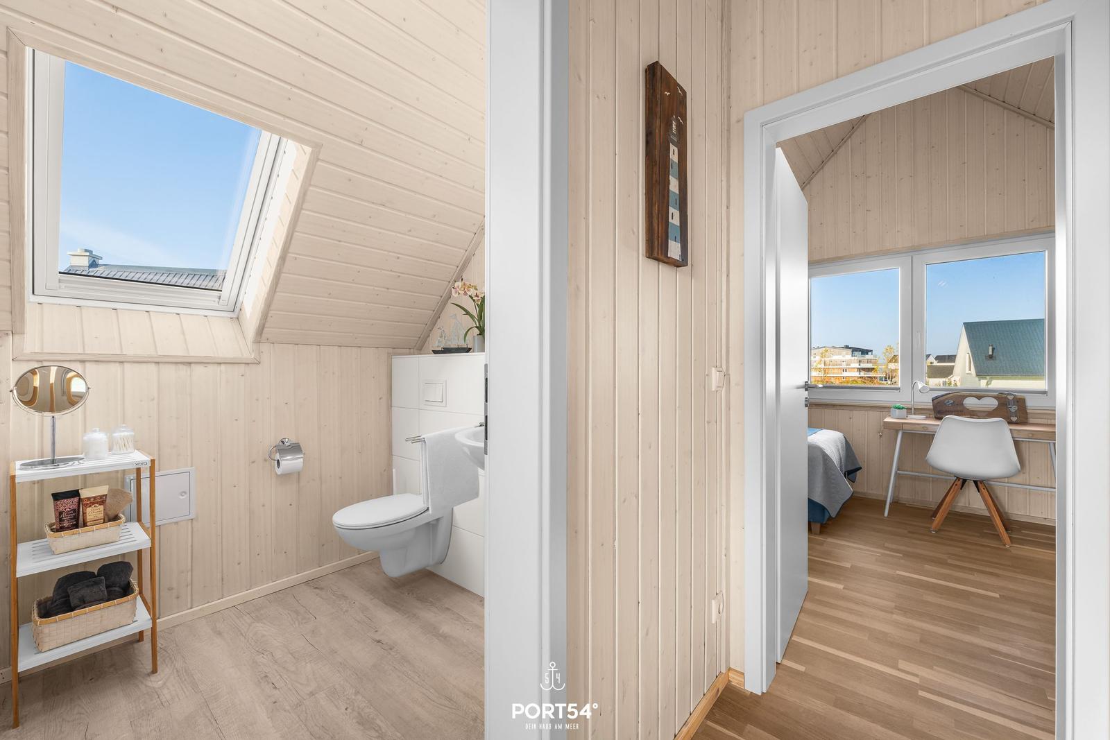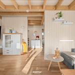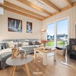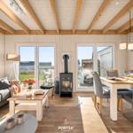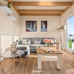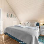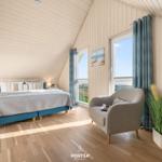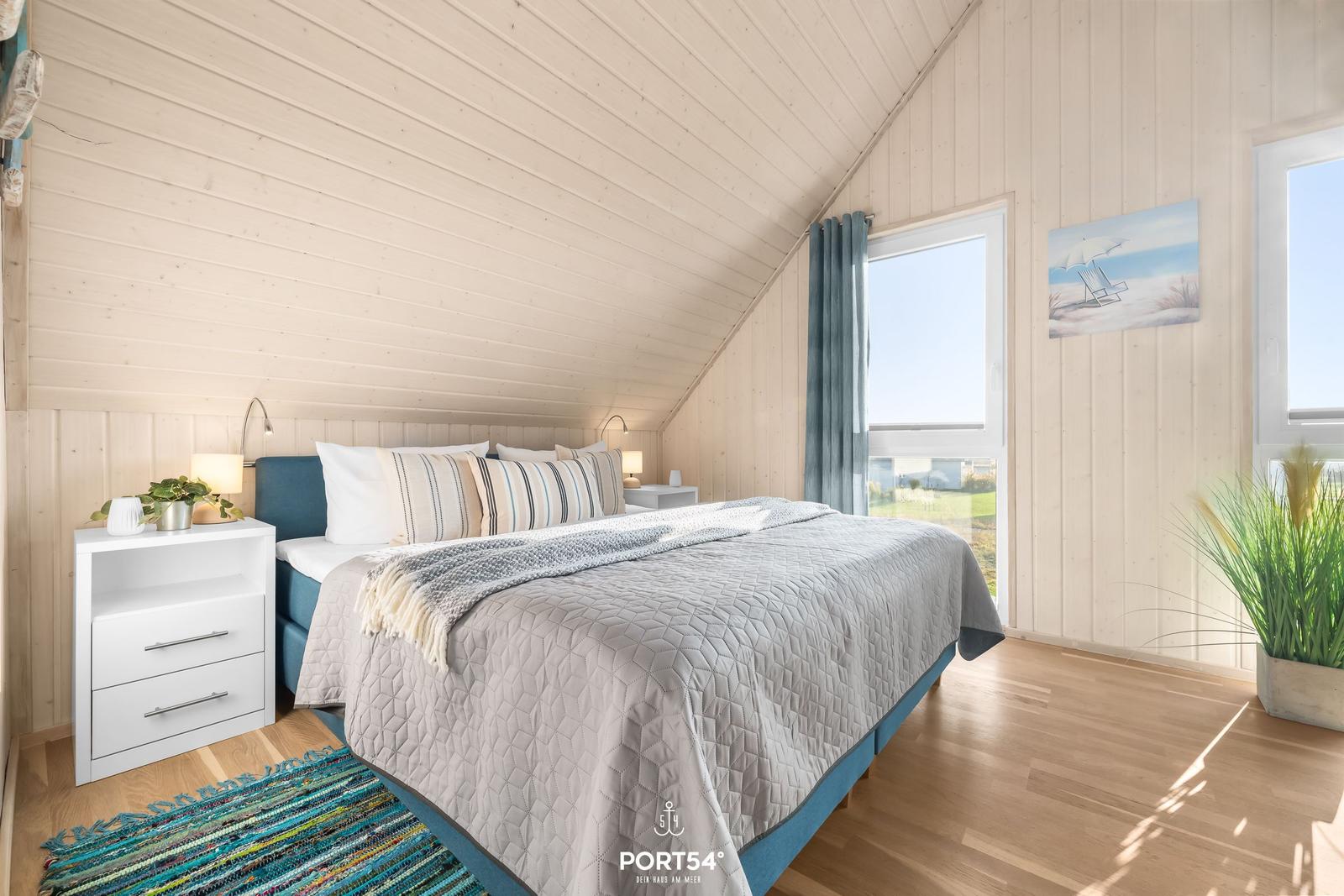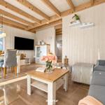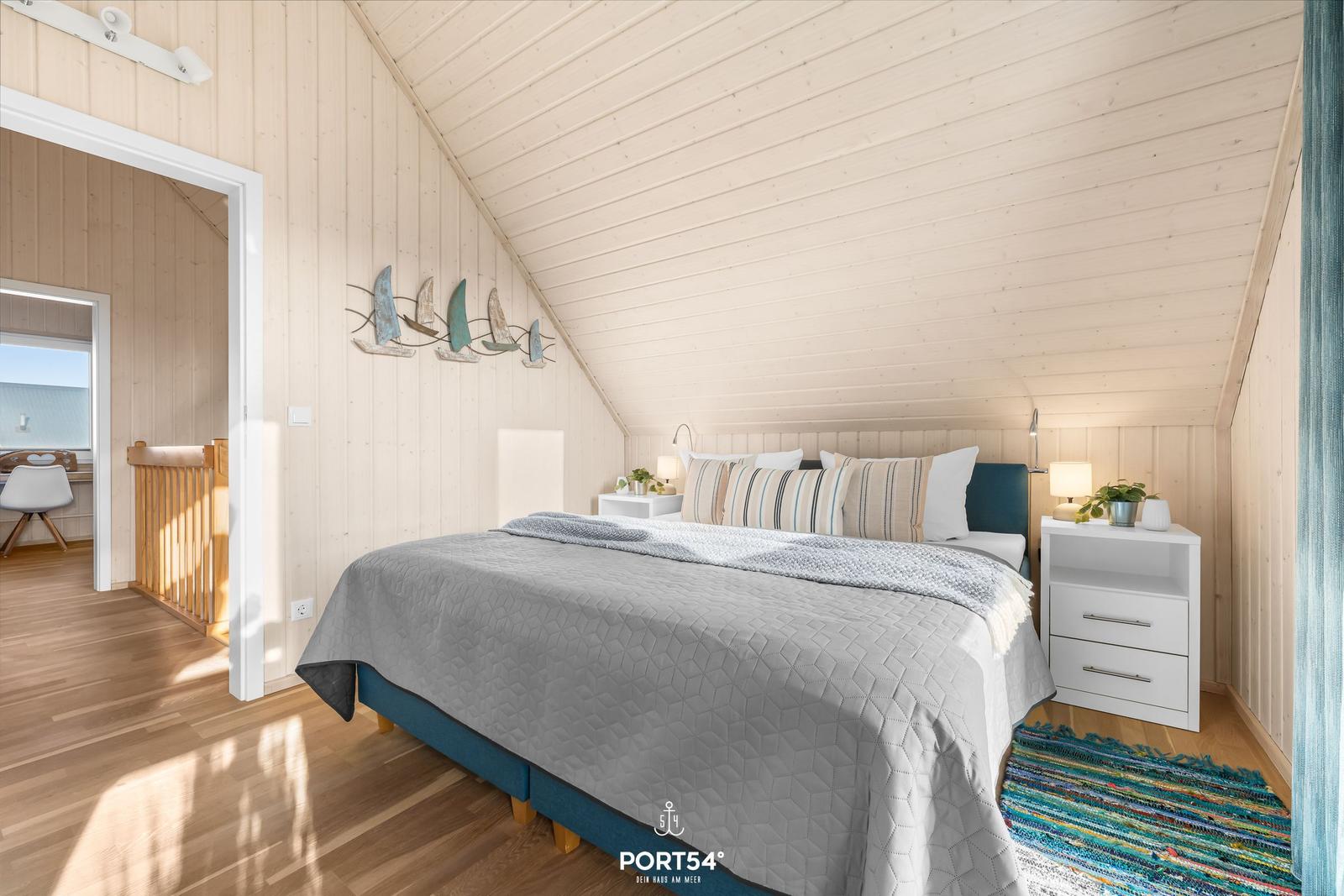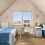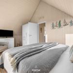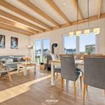 Die Ferienwohnung bietet großzügigen Wohnraum und eine moderne Ausstattung für komfortable Aufenthalte. Es stehen zwei Schlafzimmer zur Verfügung, darunter ein Doppelbett und drei Einzelbetten, ideal für Familien oder Gruppen. Der Wohnbereich ist mit einem Sofa, einem Sessel und einem Esstisch ausgestattet und sorgt für eine einladende Atmosphäre.