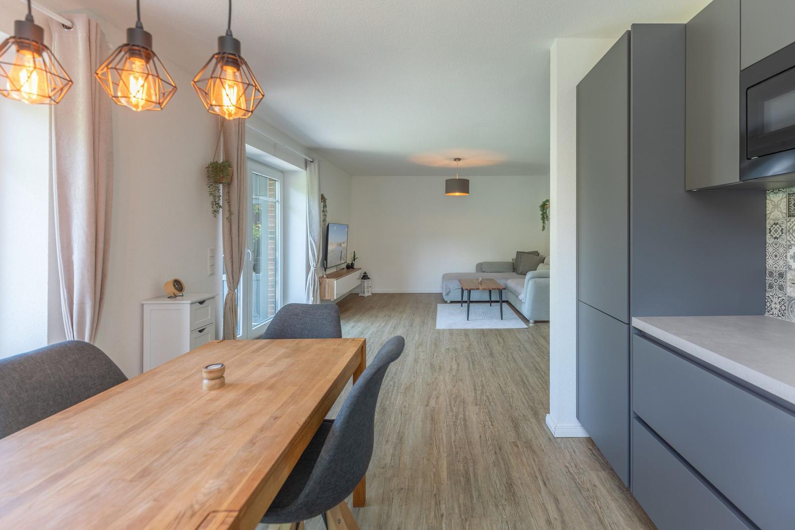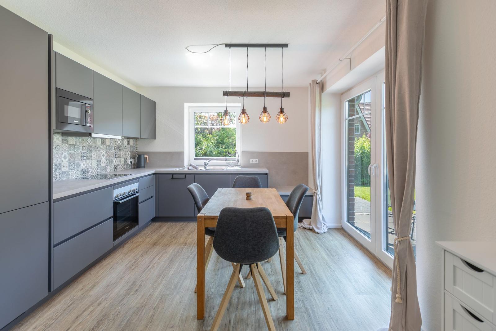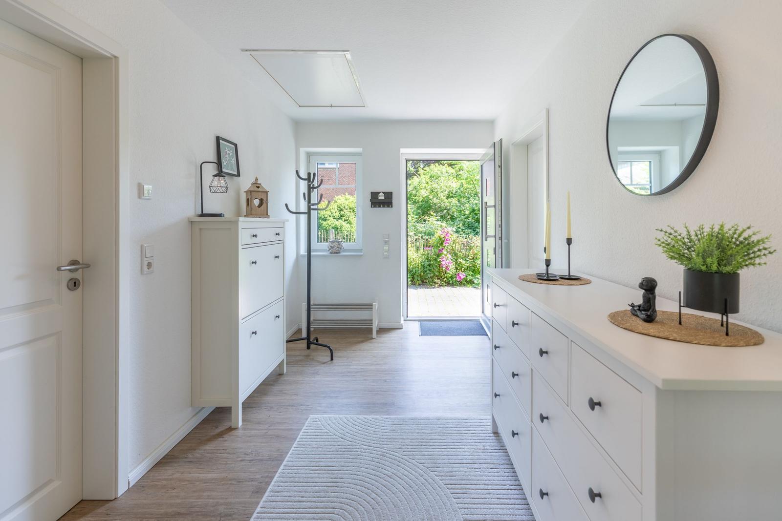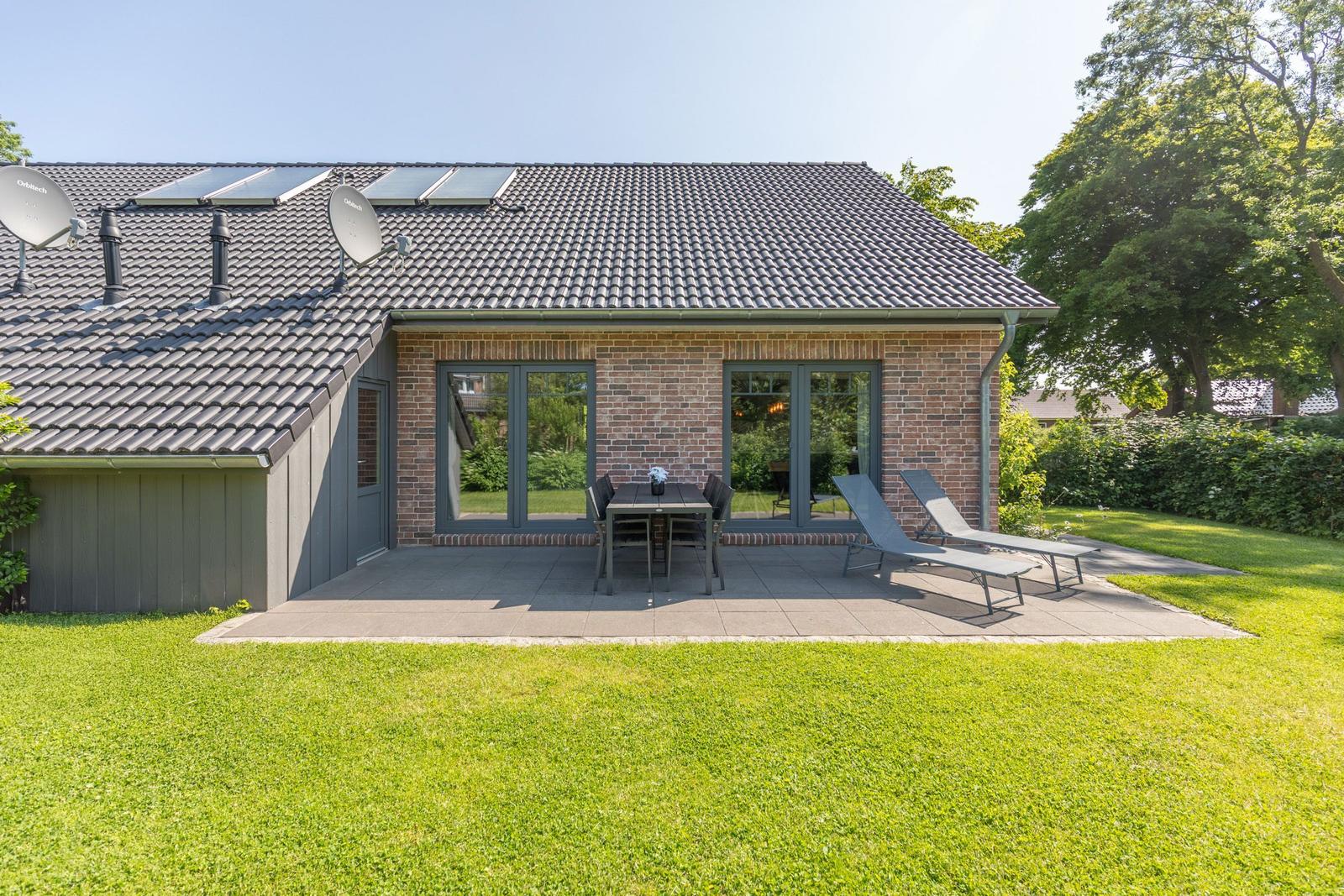 Das Ferienhaus "Norderreihe" in Ostenfeld bietet Gästen eine attraktive Außenbereichsgestaltung auf einem eingezäunten Grundstück von 380 m², das zur alleinigen Nutzung zur Verfügung steht. Hier können Familien mit Kindern unbeschwert im Garten spielen oder auf der Terrasse entspannen. Komfortable Gartenmöbel, Sonnenliegen und ein Sonnenschirm schaffen eine einladende Atmosphäre. Für gesellige Abende steht ein Kohlegrill bereit. Der Außenbereich ist somit ideal, um die Natur zu genießen und relaxed Zeit im Freien zu verbringen. Zusätzlich sorgt ein Privatparkplatz direkt am Haus, inklusive einer Ladestation für Elektroautos, für moderne Annehmlichkeiten. Die ruhige, ländliche Lage lädt zudem zu Erkundungstouren der Umgebung ein, während Bäcker und Einkaufsmöglichkeiten fußläufig erreichbar sind.