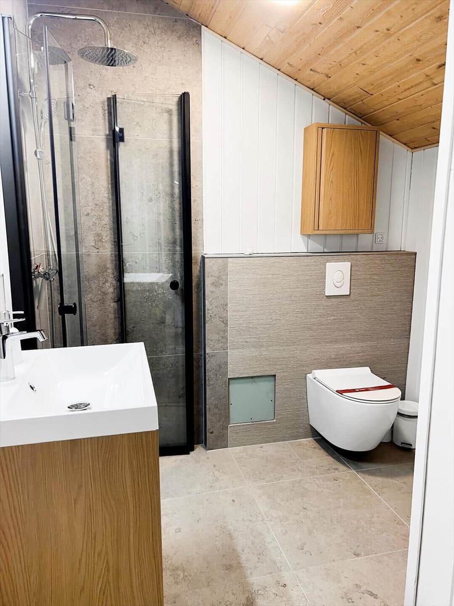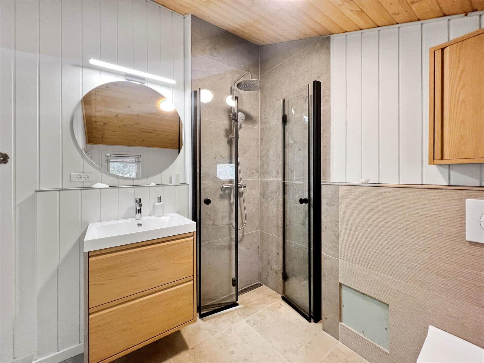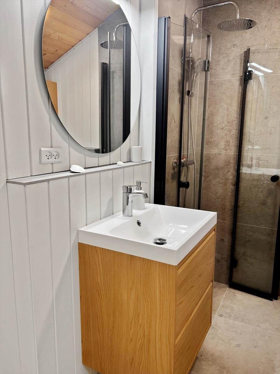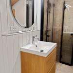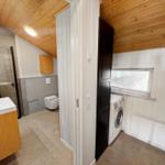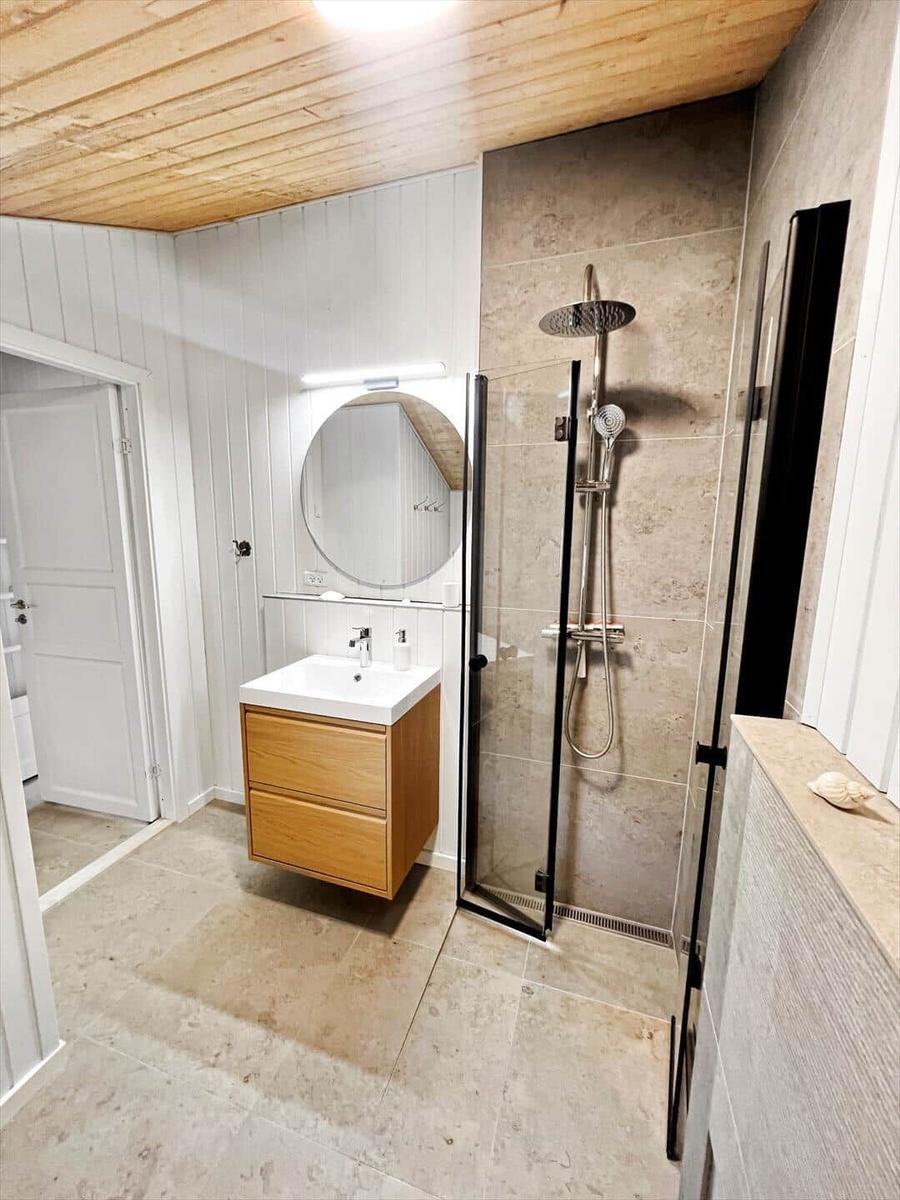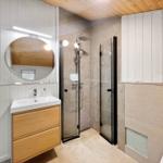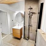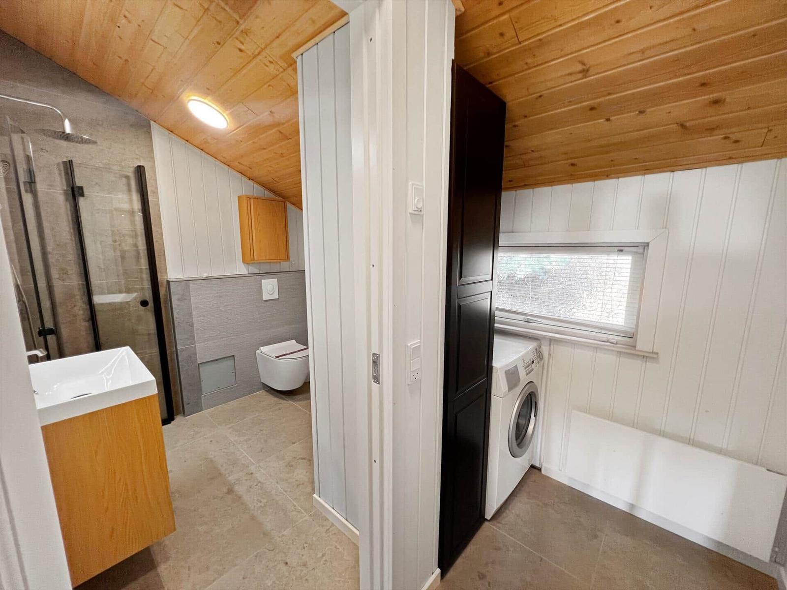 Das Badezimmer ist modern gestaltet und mit einer Dusche ausgestattet. Für den Komfort sorgt eine umfassende Küchenausstattung, die einen Geschirrspüler, Elektro-/Gasherd, Mikrowelle, Kühlschrank, Kaffeemaschine und Wasserkocher umfasst. Zudem stehen eine Waschmaschine und ein Wäschetrockner zur Verfügung.