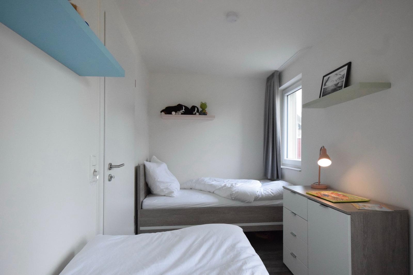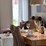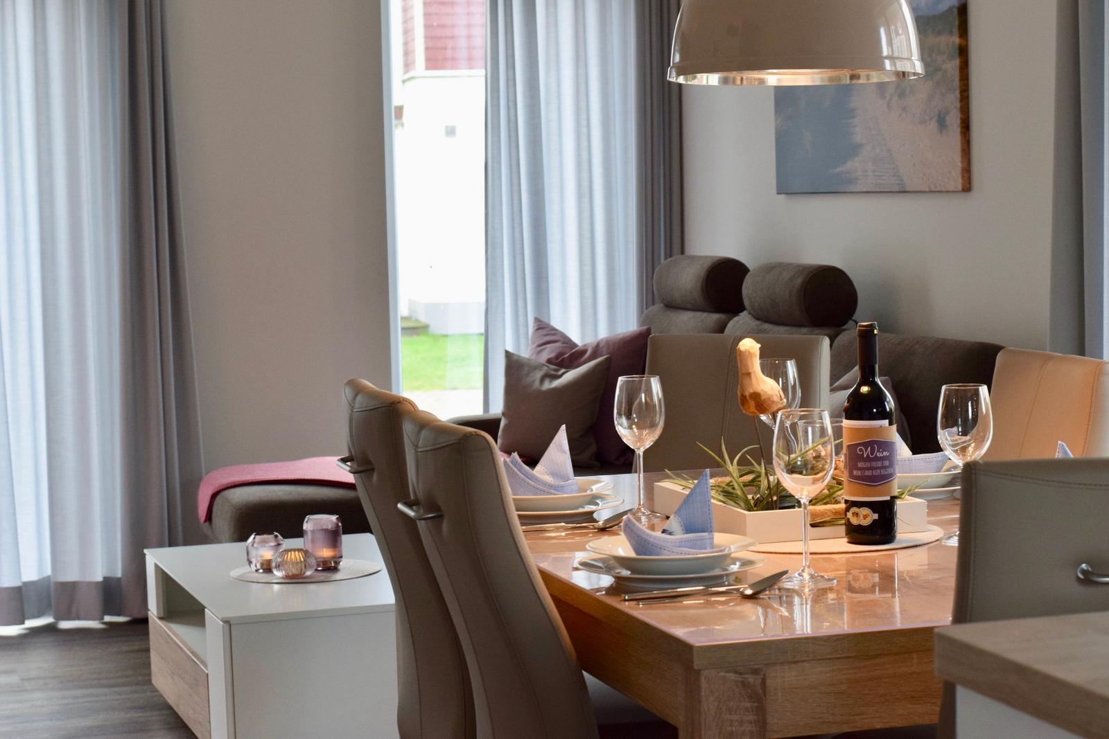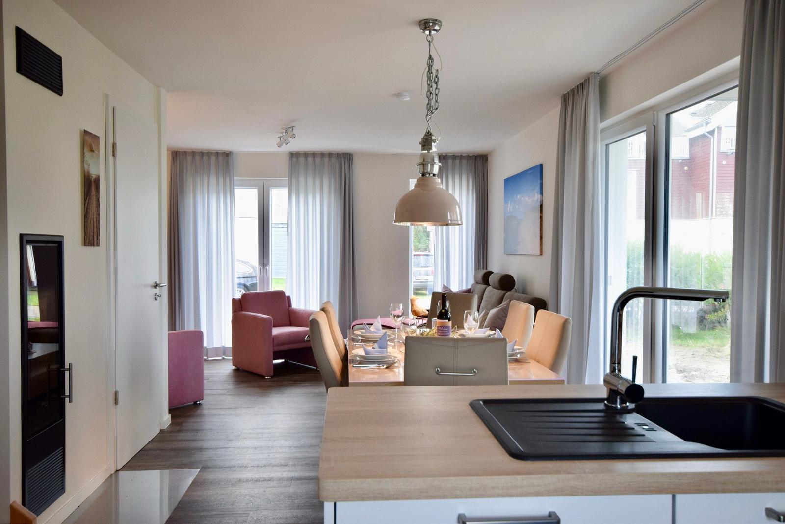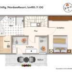 Das 120 m² große, moderne Nichtraucher-Ferienhaus erstreckt sich über drei Etagen und bietet Platz für bis zu 6 Personen. Im Erdgeschoss befindet sich eine voll ausgestattete Küche mit modernen Geräten und ein großzügiger Wohn-Essbereich mit Kamin und SMART-TV. Eine sonnige Terrasse mit Gartenmöbeln ergänzt diesen Bereich. Im Obergeschoss sind zwei Schlafzimmer mit Doppelbetten (1,80 x 2,00 m) sowie ein Tageslicht-Badezimmer mit Badewanne, Regendusche und Fußbodenheizung untergebracht. Ein Gäste-WC und die eigene Sauna runden das Angebot ab. Das Dachgeschoss bietet ein weiteres Schlafzimmer mit zwei Einzelbetten (0,90 x 2,00 m) und einen überdachten Balkon mit Meerblick, ausgestattet mit einer Sofaecke und einem weiteren SMART-TV. Für Kinder stehen ein Hochstuhl und ein Kinderbett zur Verfügung.