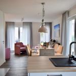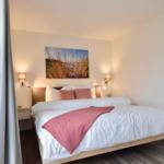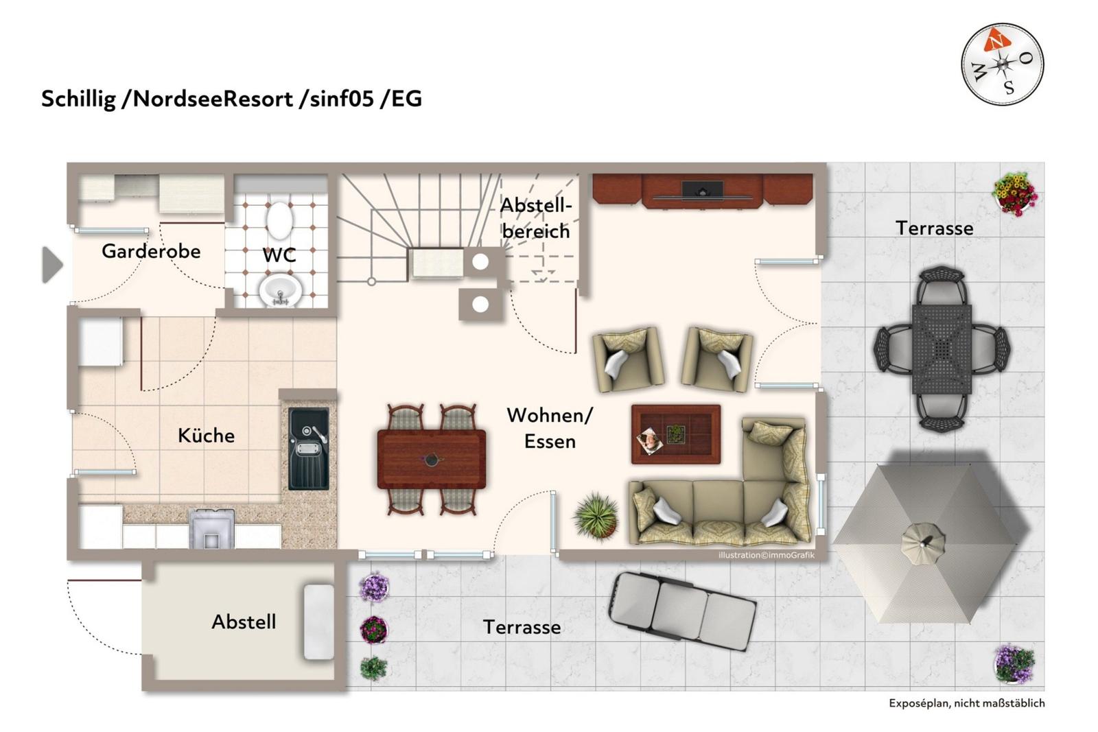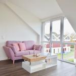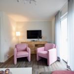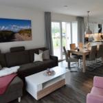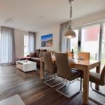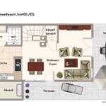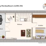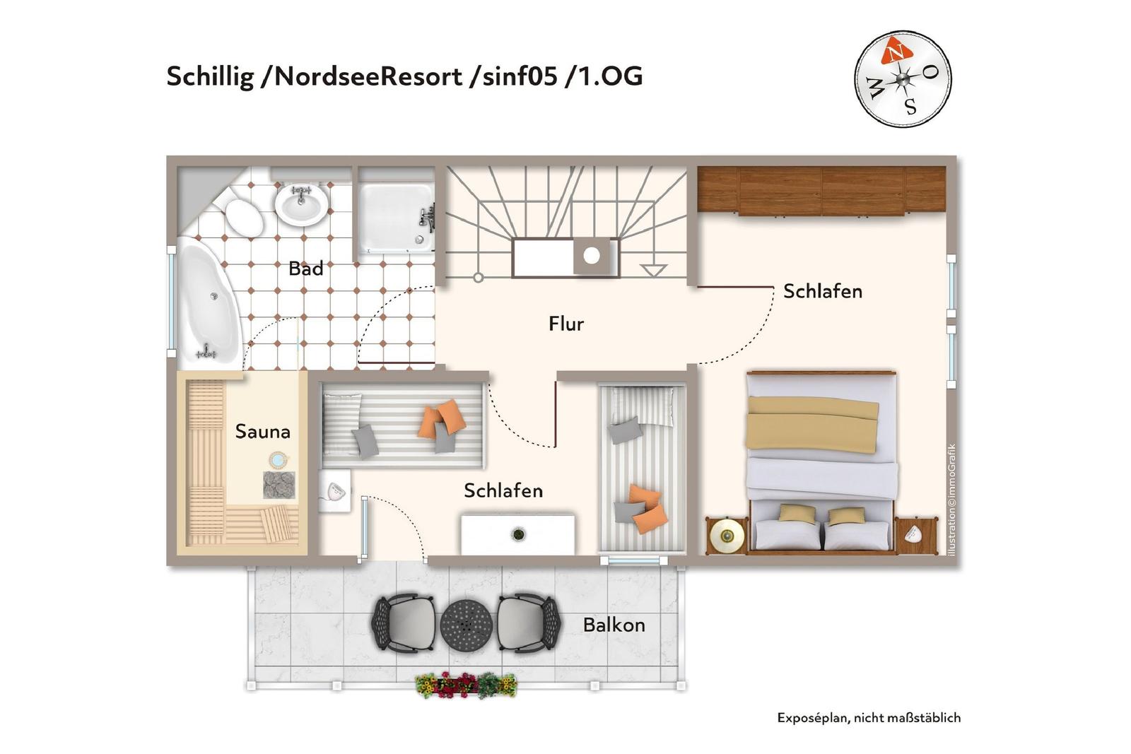 Das 120 m² große, moderne Nichtraucher-Ferienhaus erstreckt sich über drei Etagen und bietet Platz für bis zu 6 Personen. Im Erdgeschoss befindet sich eine voll ausgestattete Küche mit modernen Geräten und ein großzügiger Wohn-Essbereich mit Kamin und SMART-TV. Eine sonnige Terrasse mit Gartenmöbeln ergänzt diesen Bereich. Im Obergeschoss sind zwei Schlafzimmer mit Doppelbetten (1,80 x 2,00 m) sowie ein Tageslicht-Badezimmer mit Badewanne, Regendusche und Fußbodenheizung untergebracht. Ein Gäste-WC und die eigene Sauna runden das Angebot ab. Das Dachgeschoss bietet ein weiteres Schlafzimmer mit zwei Einzelbetten (0,90 x 2,00 m) und einen überdachten Balkon mit Meerblick, ausgestattet mit einer Sofaecke und einem weiteren SMART-TV. Für Kinder stehen ein Hochstuhl und ein Kinderbett zur Verfügung.