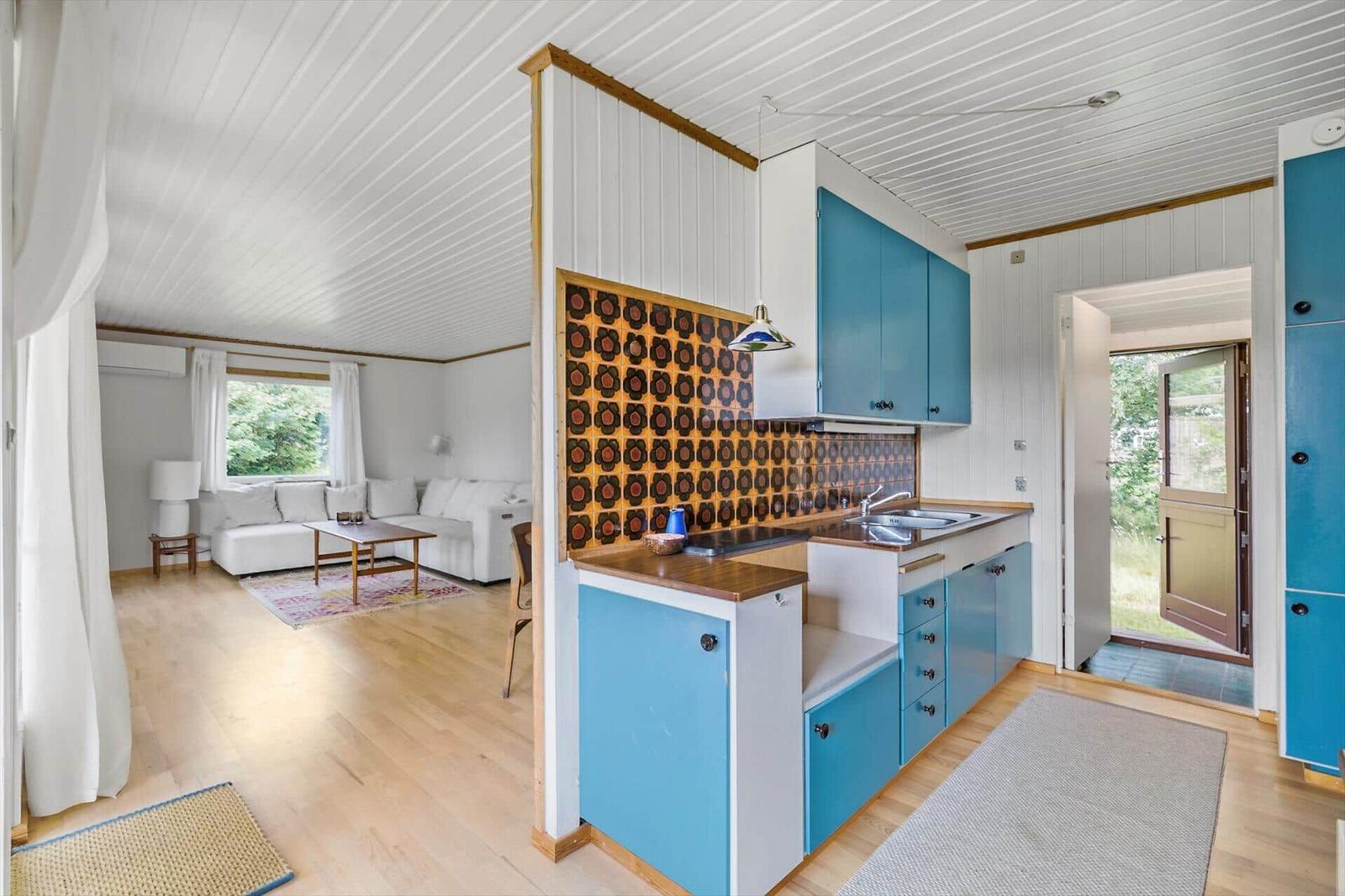 Die offene Küche ist ideal ausgestattet mit einem Elektro-/Gasherd, Kühlschrank, Kaffeemaschine, Wasserkocher und Bügeleisen, wodurch die Zubereitung von Mahlzeiten zum Vergnügen wird.