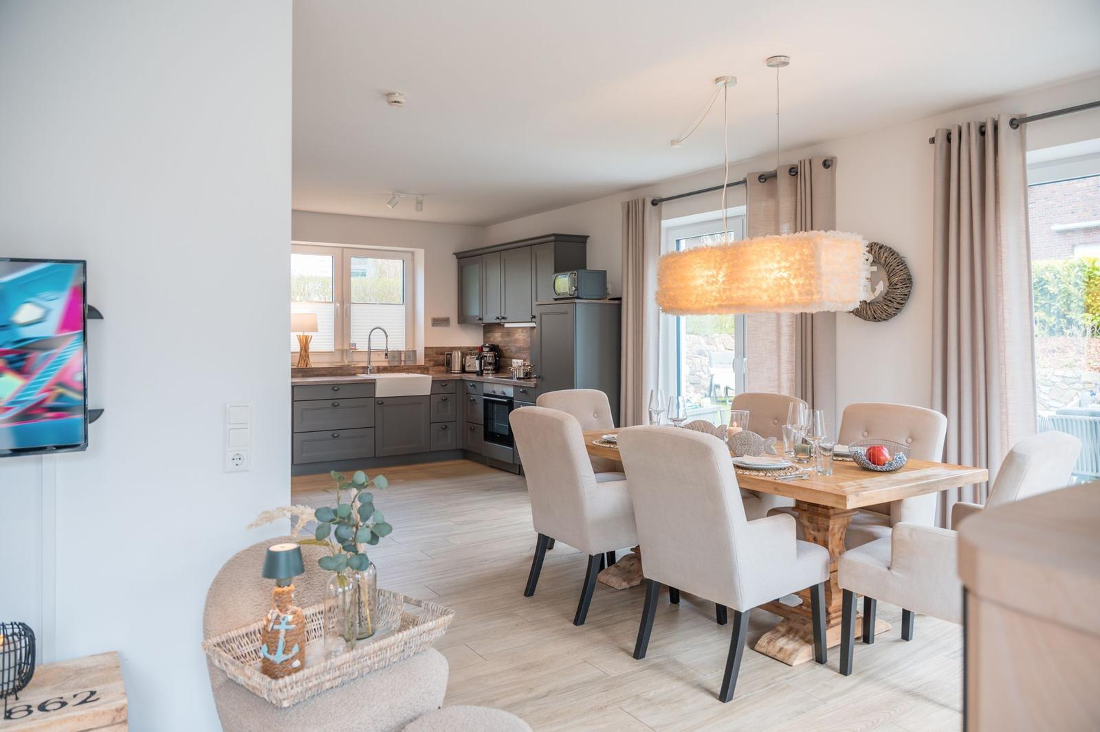 Die Ferienwohnung bietet einen hohen Komfort und eine moderne Ausstattung, ideal für entspannte Urlaubstage. Sie verfügt über drei Schlafzimmer, darunter zwei mit Doppelbetten und eines mit zwei Einzelbetten. Die offene Küche ist mit einem Geschirrspüler, Elektro-/Gasherd, Backofen, Mikrowelle, Kühlschrank, Gefriermöglichkeit, Kaffeemaschine, Espressomaschine und Toaster ausgestattet und lädt zum gemeinsamen Kochen ein. Zwei Badezimmer, eines mit bodengleicher Dusche und das andere mit Badewanne, sorgen für zusätzlichen Komfort. WLAN ist selbstverständlich vorhanden und die Einrichtung ist allergikergeeignet. Der Wohnbereich mit Sofa, Sessel und Kamin/Kachelofen sorgt für Gemütlichkeit, während die HiFi-Anlage und der TV für Unterhaltung sorgen. Ein Parkplatz, Waschmaschine, Wäschetrockner und Fußbodenheizung runden das Angebot ab. Die Wohnung ist ein perfekter Rückzugsort für Familien und Freunde.