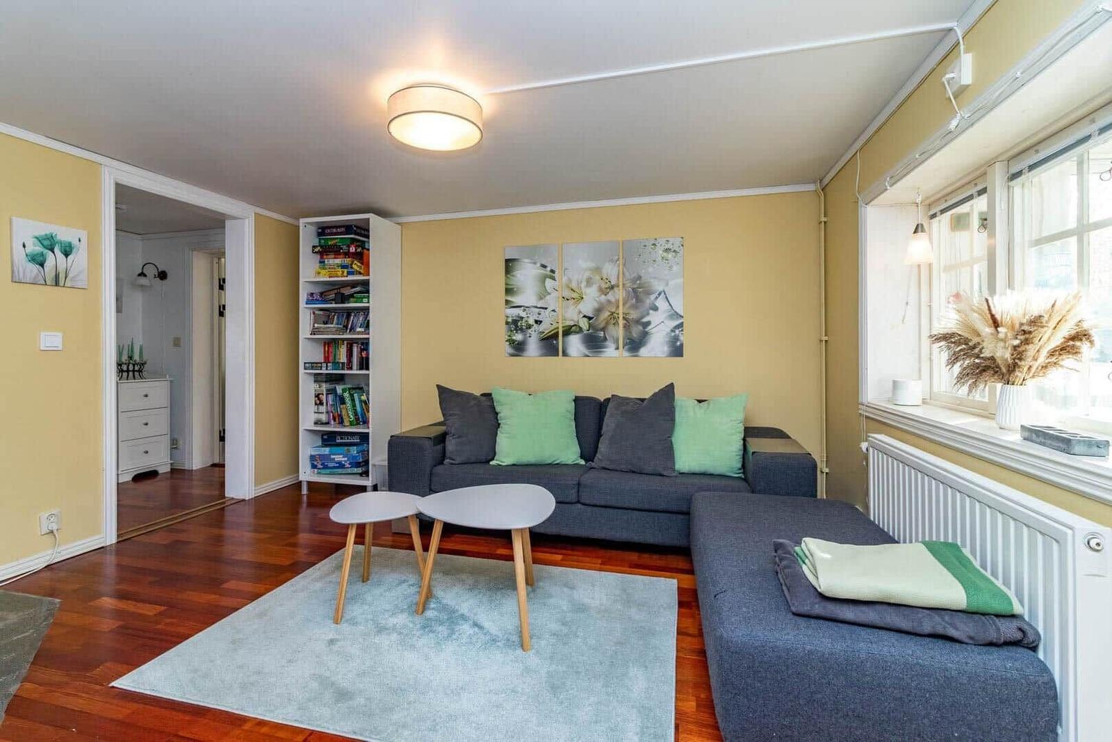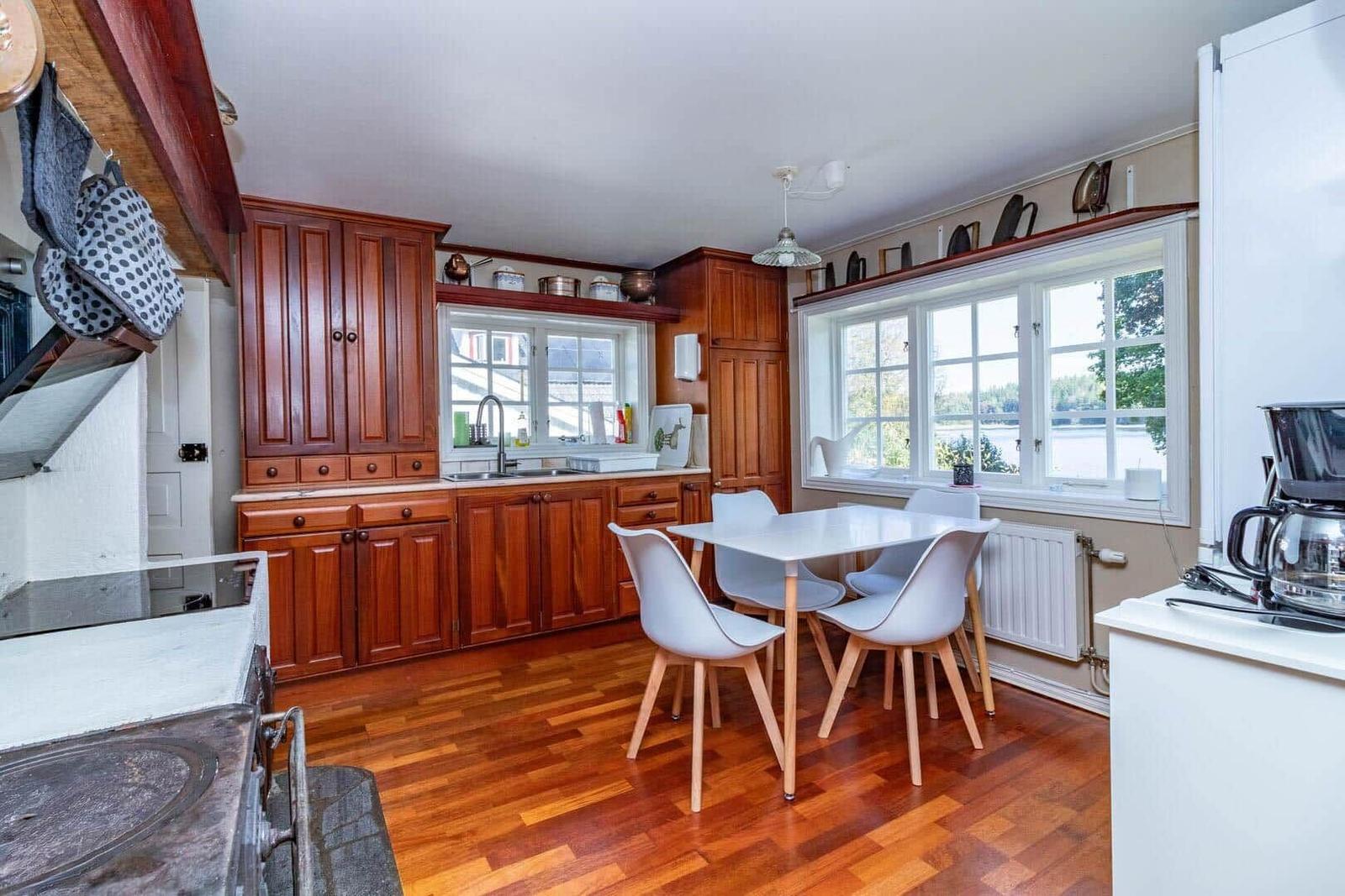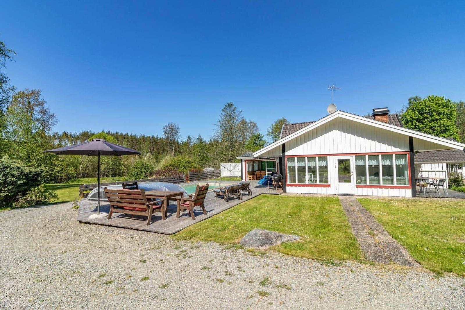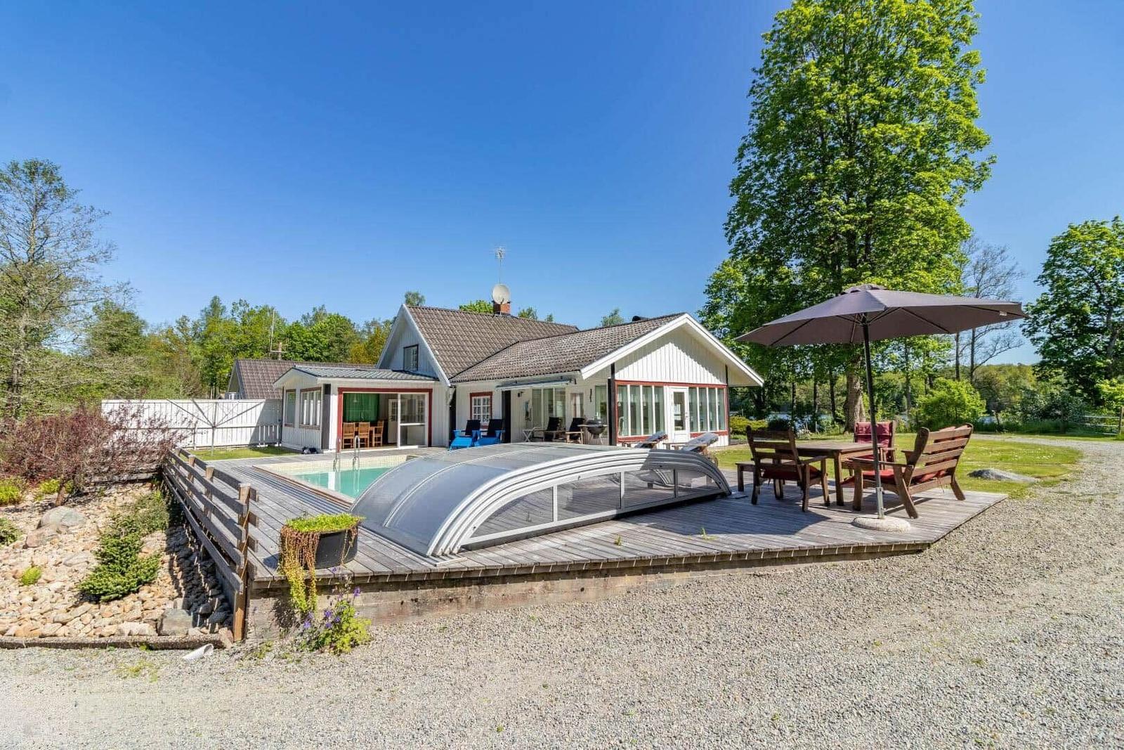 Das Ferienhaus Hökamåla bietet auf 130 m² Platz für bis zu 8 Personen und zeichnet sich durch vier Schlafzimmer aus: ein Zimmer mit 2 Einzelbetten und drei Zimmer mit Doppelbetten, eines ausgestattet mit einem Kinderbett. Zwei gemütliche Wohnzimmer, eines mit Essbereich, laden zum Verweilen ein. Die voll ausgestattete Küche umfasst ein 4-Platten-Ceranfeld, Ofen, Holzofen, Mikrowelle und Kühl- und Gefrierkombination. Das Badezimmer ist mit Dusche und WC ausgestattet, ergänzt durch einen Hauswirtschaftsraum mit Spülmaschine und Waschmaschine. Für Unterhaltung sorgen Internet und smartfähige TVs, einer mit deutschen Sendern. Zudem stehen Ruderboot, Elektromotor, Kanu und eine holzbefeuerte Badetonne zur Verfügung. Haustiere sind nach Anfrage erlaubt. Bettwäsche und Handtücher können dazugebucht werden. Jedes Gebäude bietet Zugang zu gemeinschaftlich nutzbaren Einrichtungen und Parkplatzmöglichkeiten.