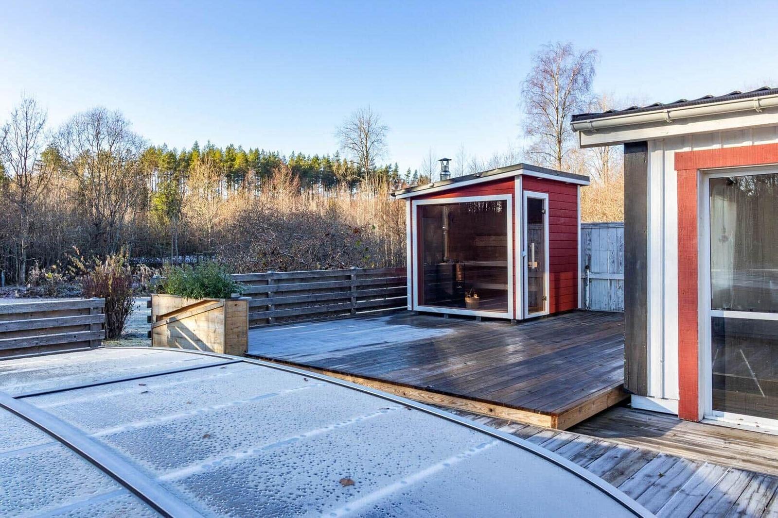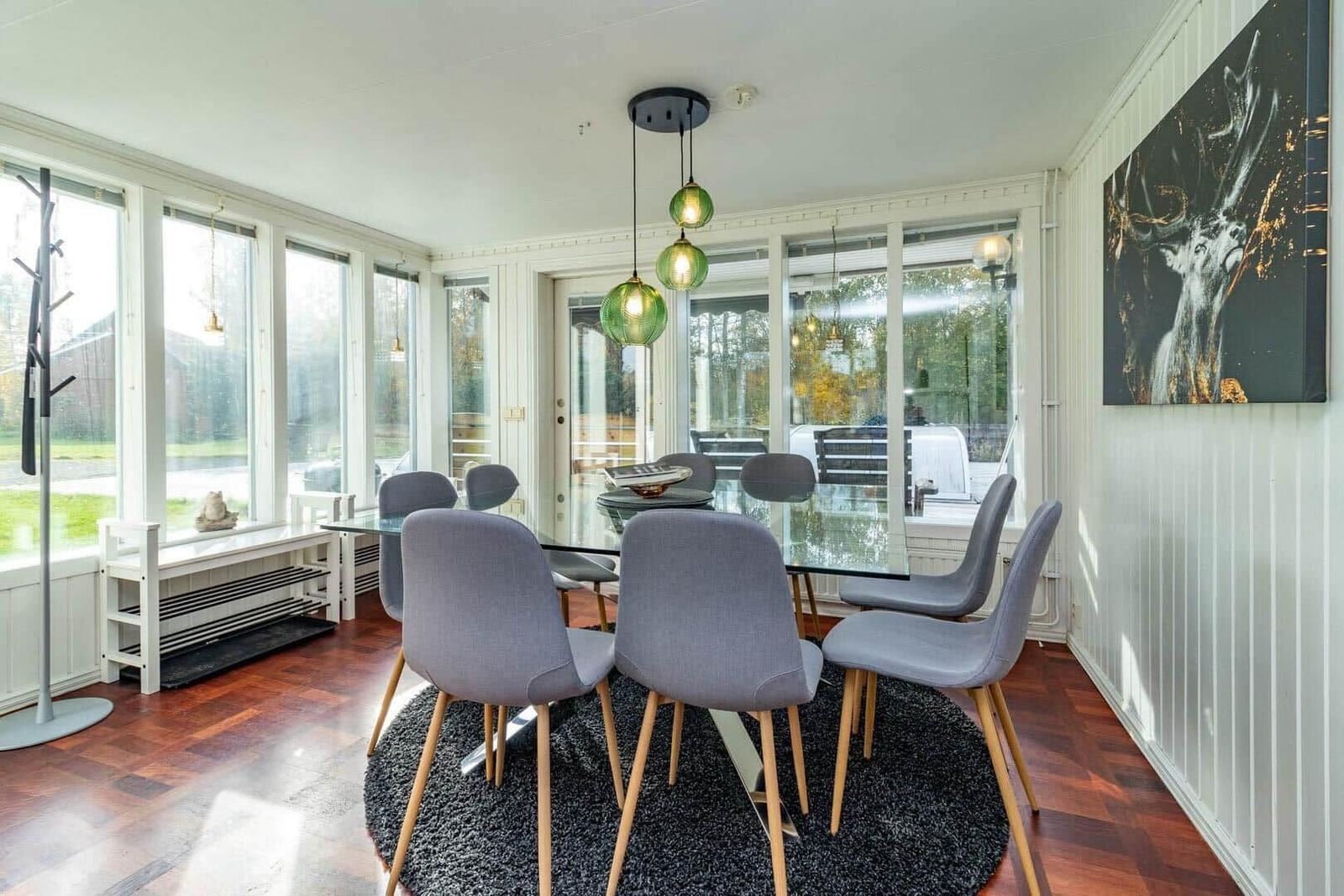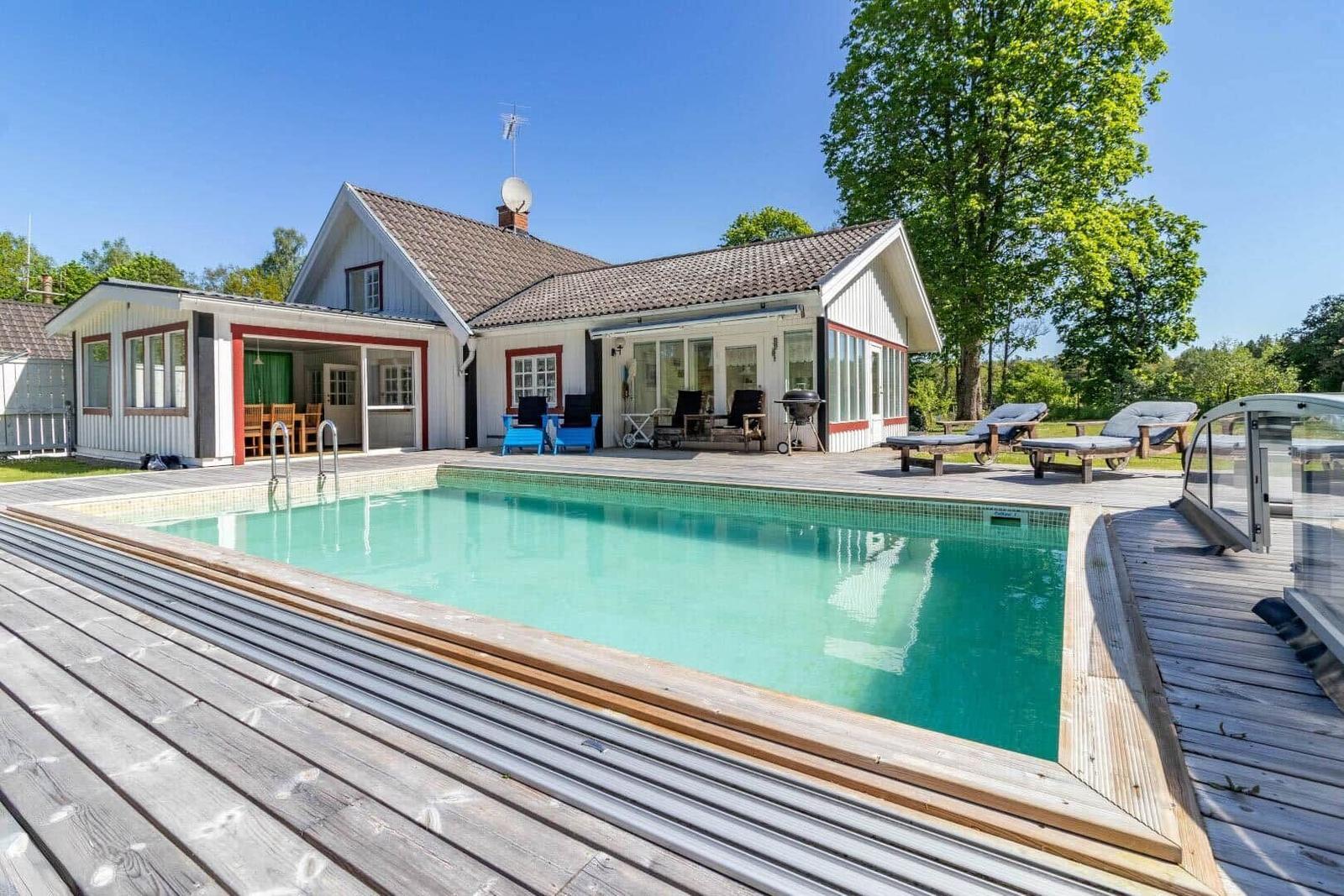 Das Ferienhaus Hökamåla bietet auf 130 m² Platz für bis zu 8 Personen und zeichnet sich durch vier Schlafzimmer aus: ein Zimmer mit 2 Einzelbetten und drei Zimmer mit Doppelbetten, eines ausgestattet mit einem Kinderbett. Zwei gemütliche Wohnzimmer, eines mit Essbereich, laden zum Verweilen ein. Die voll ausgestattete Küche umfasst ein 4-Platten-Ceranfeld, Ofen, Holzofen, Mikrowelle und Kühl- und Gefrierkombination. Das Badezimmer ist mit Dusche und WC ausgestattet, ergänzt durch einen Hauswirtschaftsraum mit Spülmaschine und Waschmaschine. Für Unterhaltung sorgen Internet und smartfähige TVs, einer mit deutschen Sendern. Zudem stehen Ruderboot, Elektromotor, Kanu und eine holzbefeuerte Badetonne zur Verfügung. Haustiere sind nach Anfrage erlaubt. Bettwäsche und Handtücher können dazugebucht werden. Jedes Gebäude bietet Zugang zu gemeinschaftlich nutzbaren Einrichtungen und Parkplatzmöglichkeiten.