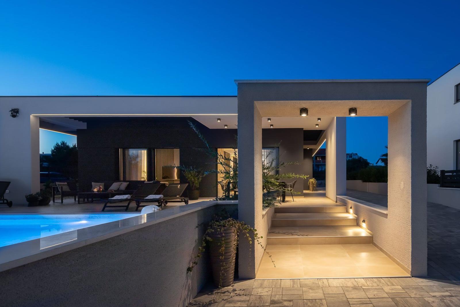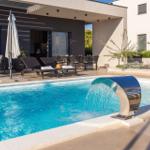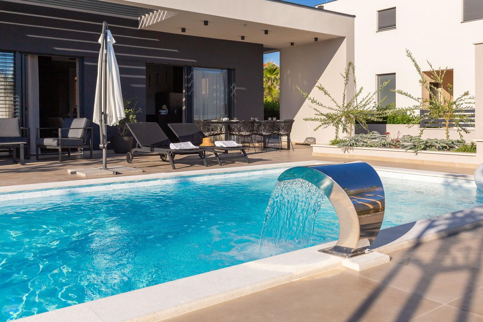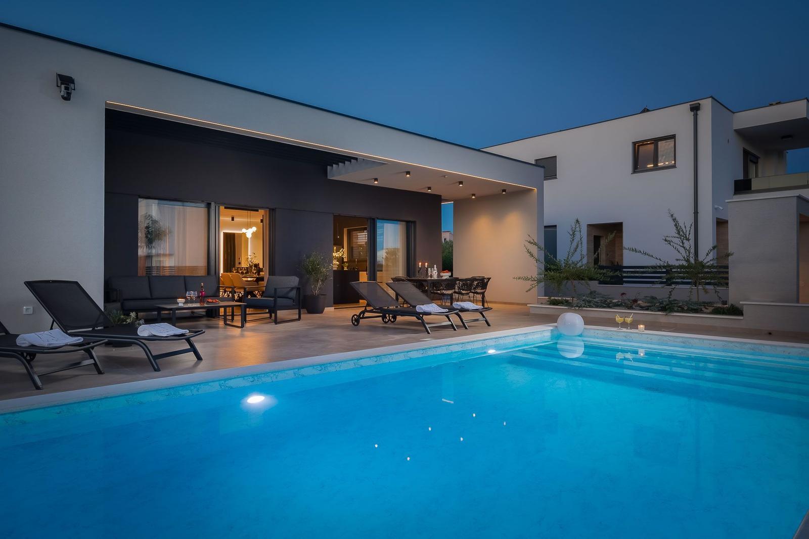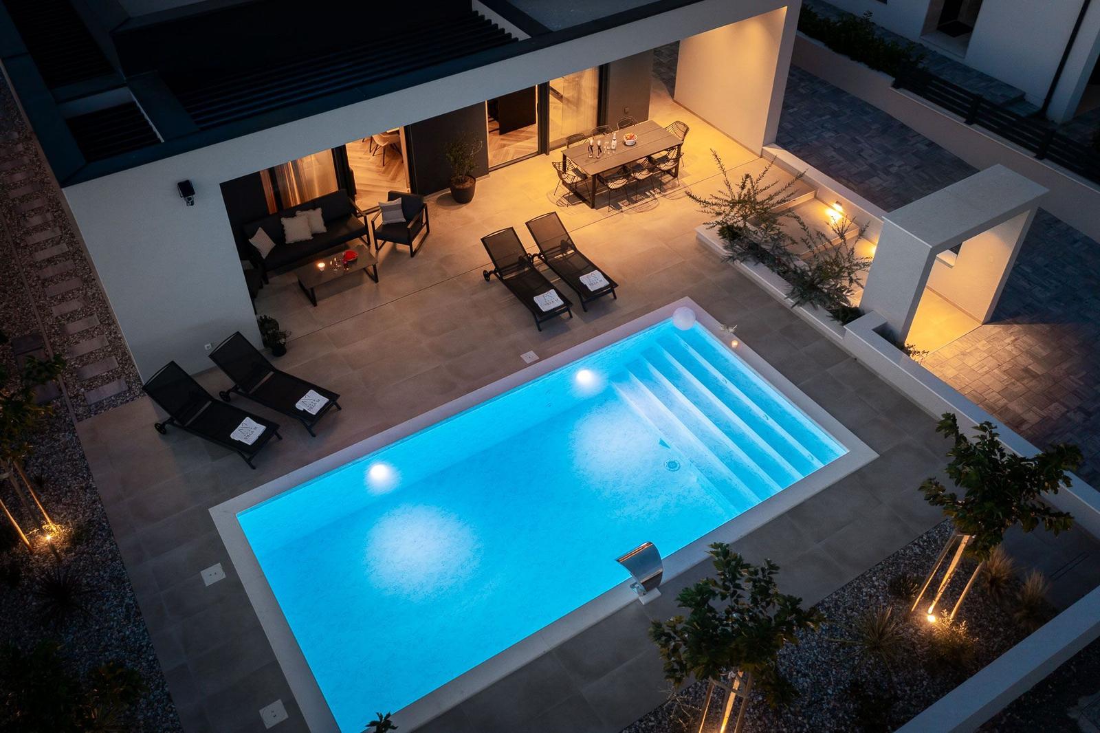 Die Villa M Luxury in Vodice überzeugt mit einem einladenden Außenbereich, der zum Entspannen und Genießen einlädt. Der beheizte Salzwasserpool mit großzügigen 32 m² bietet eine hervorragende Möglichkeit, sich abzukühlen, während stilvolle Sonnenliegen zum Sonnenbaden einladen. Die weitläufige Terrasse ist mit einem Essbereich und einer Grillmöglichkeit ausgestattet, ideal für gesellige Abende im Freien. Eine gemütliche Lounge-Zone sorgt für einen komfortablen Aufenthaltsbereich, der bei stimmungsvollem Licht am Abend besonders einladend wirkt. Diese exklusive Villa liegt nur 1,5 Kilometer vom lebhaften Zentrum Vodices entfernt und ermöglicht Gästen, den Außenbereich sowohl in Ruhe als auch in geselligem Rahmen zu nutzen. Bis zu 6 Gäste finden in dieser Privatsphäre Platz, um den Außenbereich in vollen Zügen zu genießen.