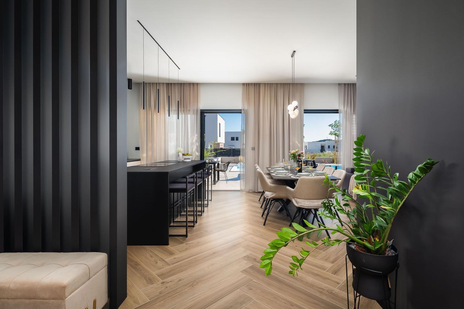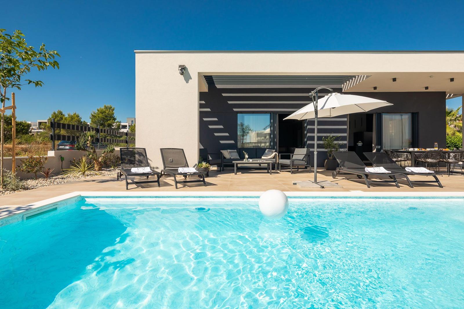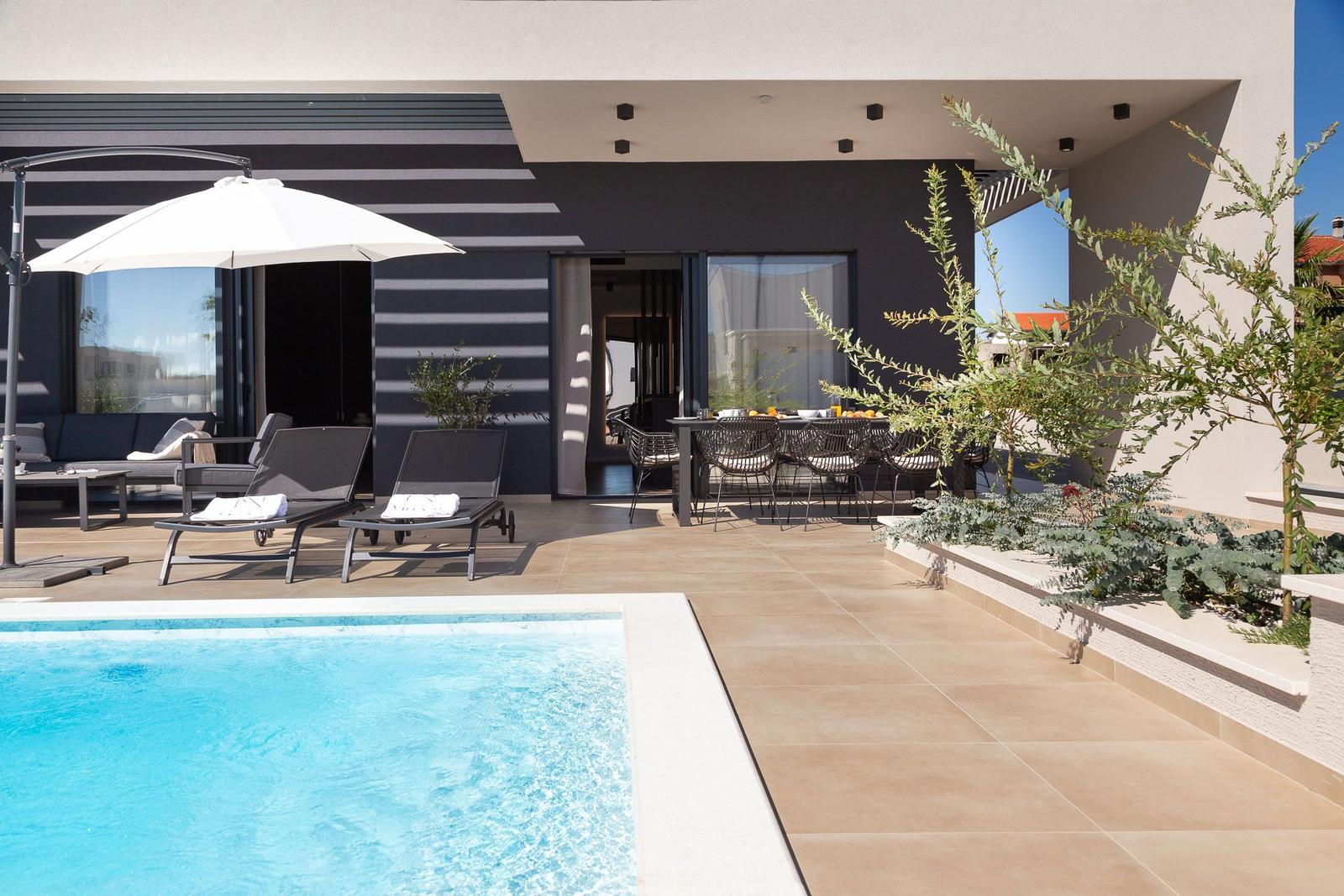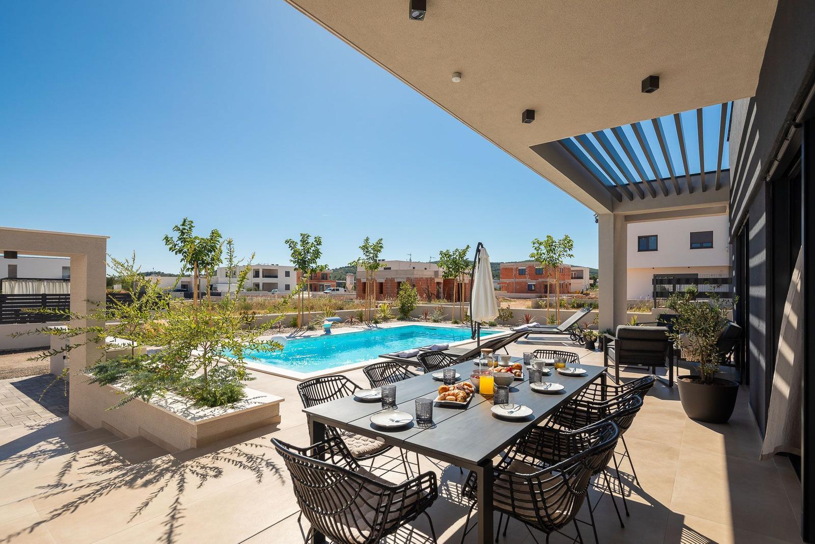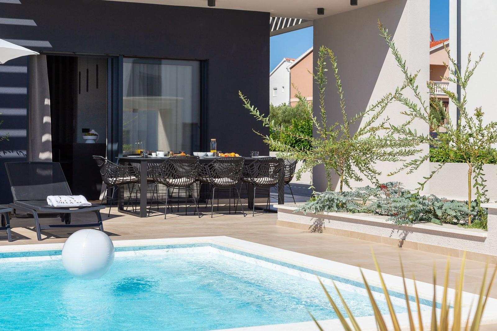 Die Villa M Luxury in Vodice überzeugt mit einem einladenden Außenbereich, der zum Entspannen und Genießen einlädt. Der beheizte Salzwasserpool mit großzügigen 32 m² bietet eine hervorragende Möglichkeit, sich abzukühlen, während stilvolle Sonnenliegen zum Sonnenbaden einladen. Die weitläufige Terrasse ist mit einem Essbereich und einer Grillmöglichkeit ausgestattet, ideal für gesellige Abende im Freien. Eine gemütliche Lounge-Zone sorgt für einen komfortablen Aufenthaltsbereich, der bei stimmungsvollem Licht am Abend besonders einladend wirkt. Diese exklusive Villa liegt nur 1,5 Kilometer vom lebhaften Zentrum Vodices entfernt und ermöglicht Gästen, den Außenbereich sowohl in Ruhe als auch in geselligem Rahmen zu nutzen. Bis zu 6 Gäste finden in dieser Privatsphäre Platz, um den Außenbereich in vollen Zügen zu genießen.