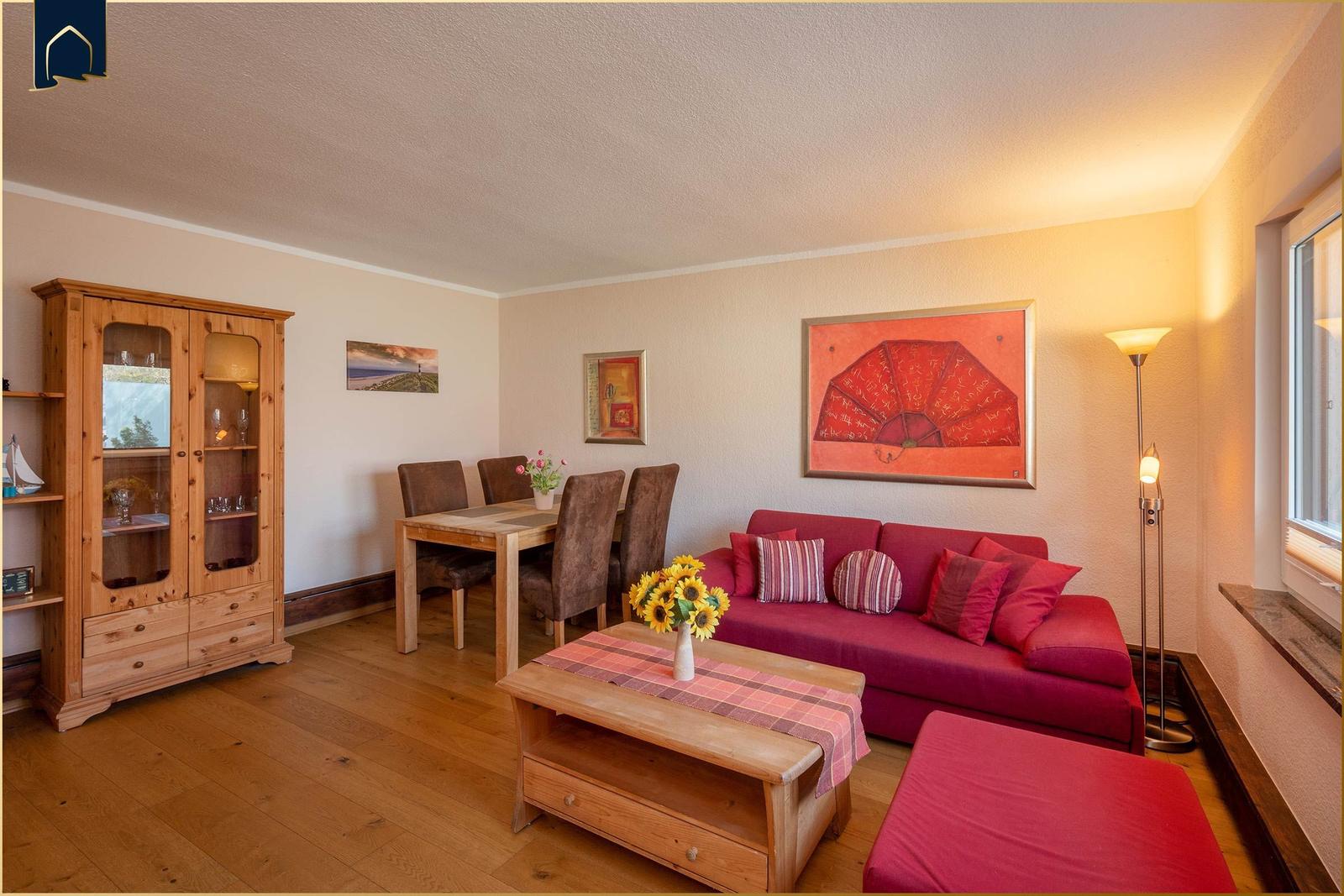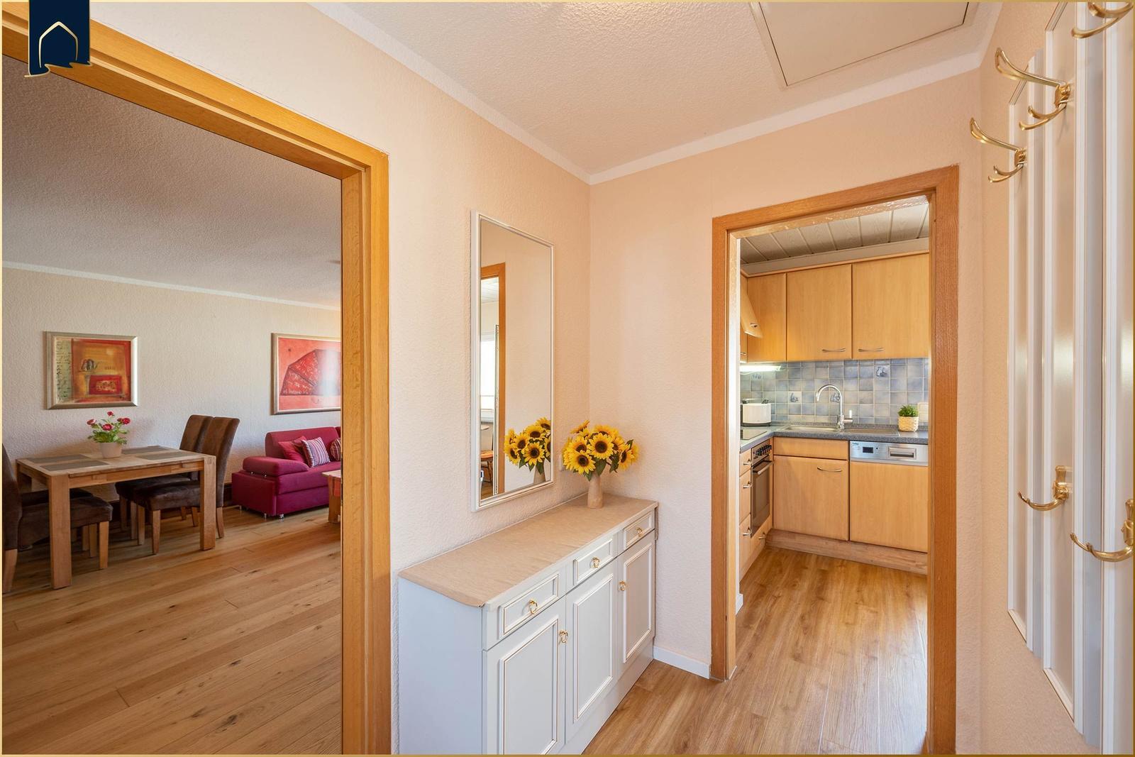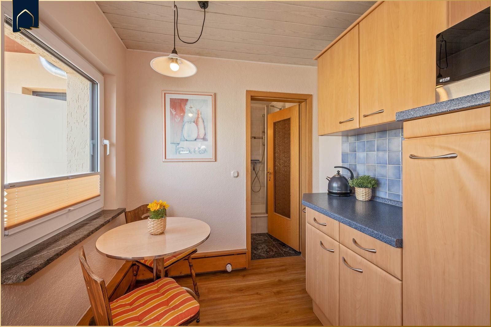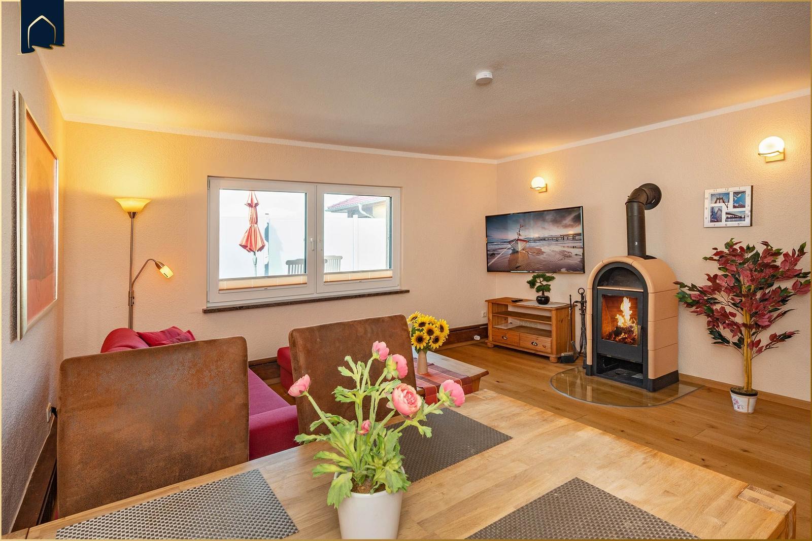 Die Ferienwohnung bietet großzügige Räume und eine moderne Ausstattung, die den Aufenthalt zu einem komfortablen Erlebnis macht. Im Schlafzimmer befindet sich ein gemütliches Doppelbett, während das Schlafsofa im Wohnbereich mit Lattenrost für einen angenehmen Schlaf sorgt. Die voll ausgestattete Küche verfügt über einen Elektro-/Gasherd, Backofen, Mikrowelle, Geschirrspüler und Kühlschrank, ergänzt durch Geschirr, Besteck und eine Kaffeemaschine. Das Badezimmer mit Fenster und Duschbad bietet einen Haartrockner sowie Spiegel. Der Kamin/Kachelofen sorgt für eine wohlige Atmosphäre an kühleren Tagen. Kostenloses WLAN ist selbstverständlich, und die Wohnung ist allergikergeeignet. Für zusätzlichen Komfort sorgen Fliegengitter, Heizung, ein Esstisch und ein TV. Der Parkplatz direkt vor der Tür und der Sonnenschirm im Außenbereich runden das Angebot ab. Hier finden Gäste alles, was sie für einen entspannten Aufenthalt benötigen.