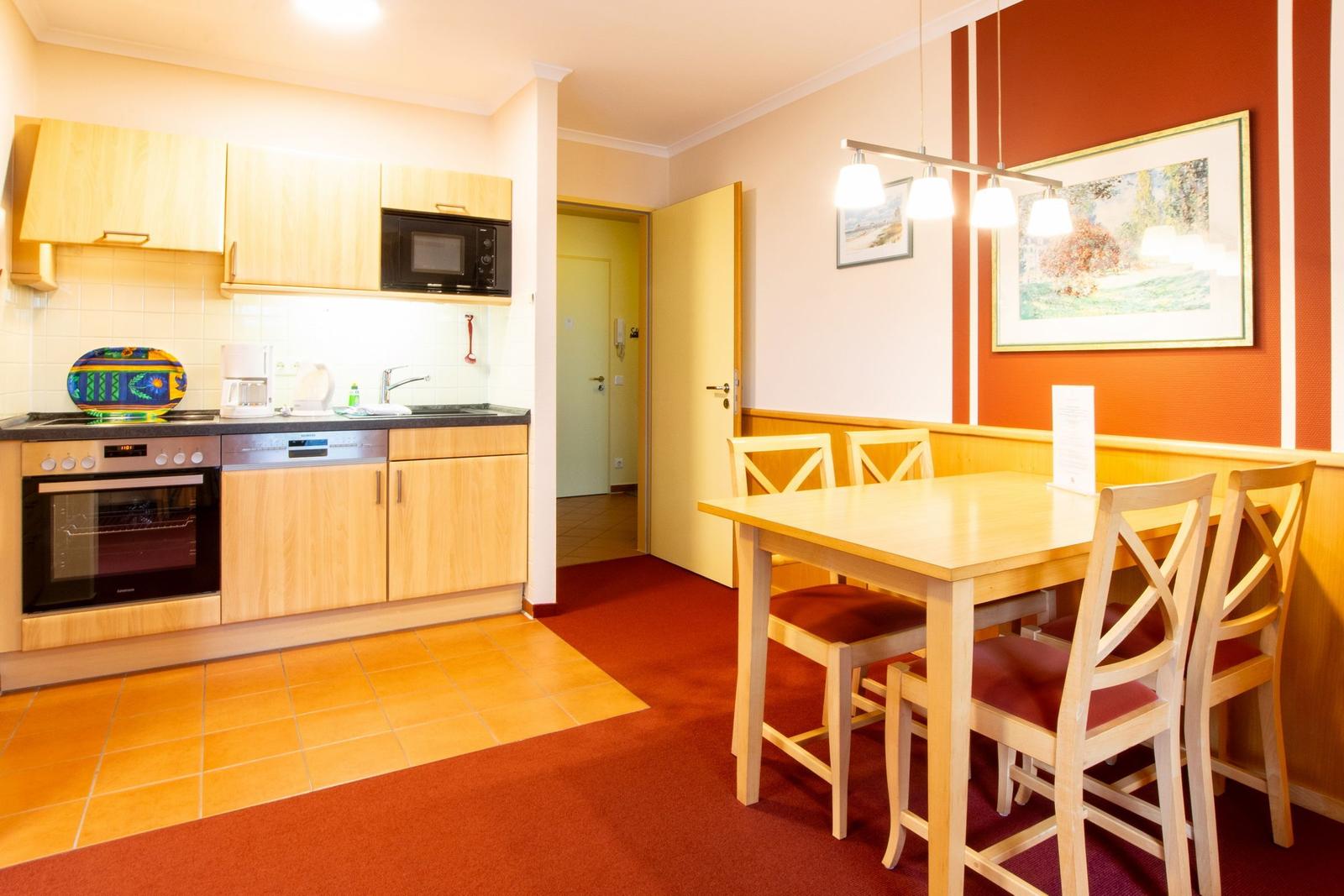 Die Ferienwohnung bietet eine moderne und gemütliche Unterkunft für bis zu drei Personen. Sie verfügt über ein Schlafzimmer mit einem Doppelbett und ein Wohnschlafzimmer, das mit einem Einzelbett ausgestattet ist. Die offene Küche ist vollständig ausgestattet mit einem Geschirrspüler, Elektro-/Gasherd, Backofen, Mikrowelle, Kühlschrank, Kaffeemaschine, Toaster und Gefriermöglichkeit – ideal für Selbstversorger. Das Badezimmer ist mit einer Dusche, einem Haartrockner sowie einem Kosmetikspiegel ausgestattet. Für Unterhaltung sorgt eine HiFi-Anlage und ein TV. WLAN-Internet steht kostenlos zur Verfügung. Die allergikergeeignete Wohnung verfügt über eine Heizung und ist rauchfrei. Ein Parkplatz ist ebenfalls vorhanden. Im gemeinsamen Bereich stehen Brettspiele zur Verfügung, und auf der Terrasse gibt es einen Sonnenschirm. Fliegengitter sorgen für ungestörten Schlaf. Staubsauger und Wäscheständer sind ebenfalls vorhanden. Diese Ferienwohnung kombiniert Komfort und Funktionalität für einen erholsamen Aufenthalt.