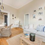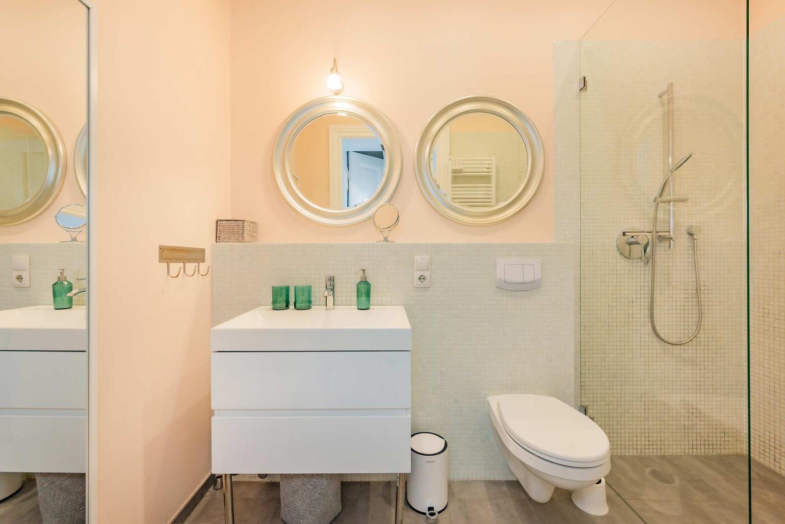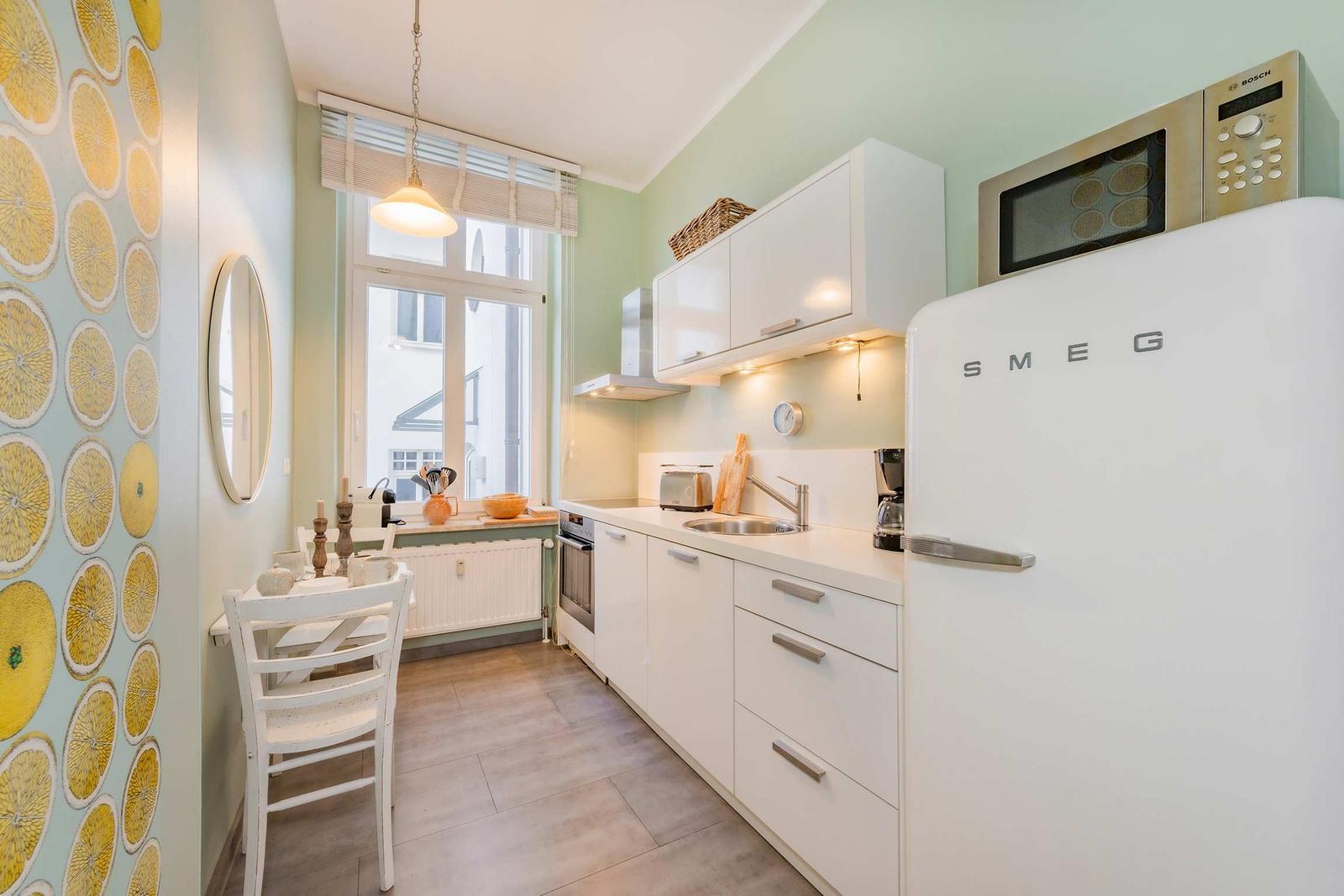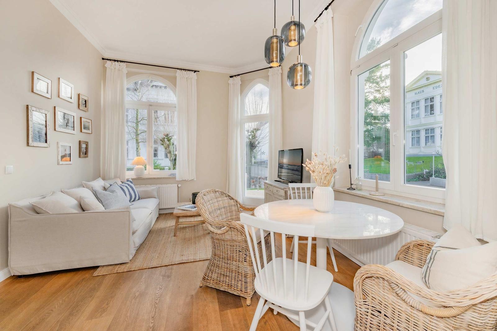 Die Ferienwohnung Nummer 14 im Schloss Hohenzollern beeindruckt durch ihren stilvollen Rückzugsort in der charmanten Bäderarchitektur von Ahlbeck. Mit einer großzügigen Fläche von 72 m² bietet die Wohnung einen harmonischen Mix aus historischem Flair und modernem Wohnkomfort. Zwei geschmackvoll eingerichtete Schlafzimmer sind mit komfortablen Betten (1,80 m x 2,00 m und 1,60 m x 2,00 m) sowie großen Kleiderschränken ausgestattet. Die separate, voll ausgestattete Küche ermöglicht die Zubereitung von Köstlichkeiten, während der Wohnraum mit einer bequemen Couch und einem Flat-TV mit Streaming-Zugang zu gemütlichen Abenden einlädt. Das moderne Bad überzeugt mit stilvollen Materialien und einer bodengleichen Dusche. Gemeinschaftlich nutzbare Waschmaschine und Trockner sowie ein abschließbarer Fahrradkeller stehen zur Verfügung, ideal für aktive Gäste. Ein kostenfreier WLAN-Zugang ergänzt das Angebot.