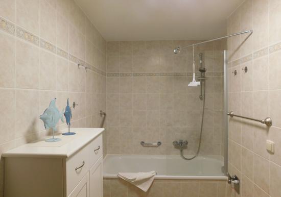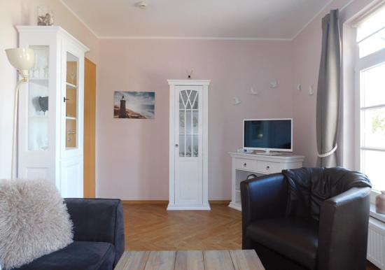 Das Badezimmer verfügt über eine Dusche, und ein Haartrockner ist ebenfalls vorhanden. Für Unterhaltung sorgen ein Fernseher und eine HiFi-Anlage. Die Wohnung ist allergikergeeignet und bietet eine angenehme Atmosphäre mit einem Sofa, Sessel und Esstisch.