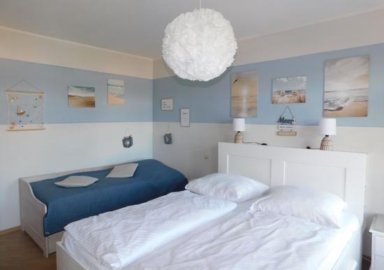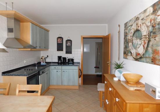 Die Ferienwohnung bietet einen komfortablen Rückzugsort mit durchdachter Ausstattung. Sie beherbergt ein Schlafzimmer mit einem Doppelbett und ein Wohnschlafzimmer mit einem Einzelbett, ideal für Reisende. Die offene Küche ist mit modernsten Geräten ausgestattet, darunter ein Geschirrspüler, Elektro-/Gasherd, Backofen, Kühlschrank, Kaffeemaschine, Toaster und Wasserkocher. Ein Gefrierfach sorgt für zusätzliche Kühlmöglichkeiten.