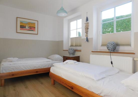 Die Ferienwohnung bietet eine hochwertige Ausstattung und modernen Komfort für einen entspannenden Aufenthalt. Sie verfügt über drei Schlafzimmer, darunter zwei mit Doppelbetten und eines mit zwei Einzelbetten, sowie drei Badezimmer, die mit Fenster, Duschbad und Haartrockner ausgestattet sind.