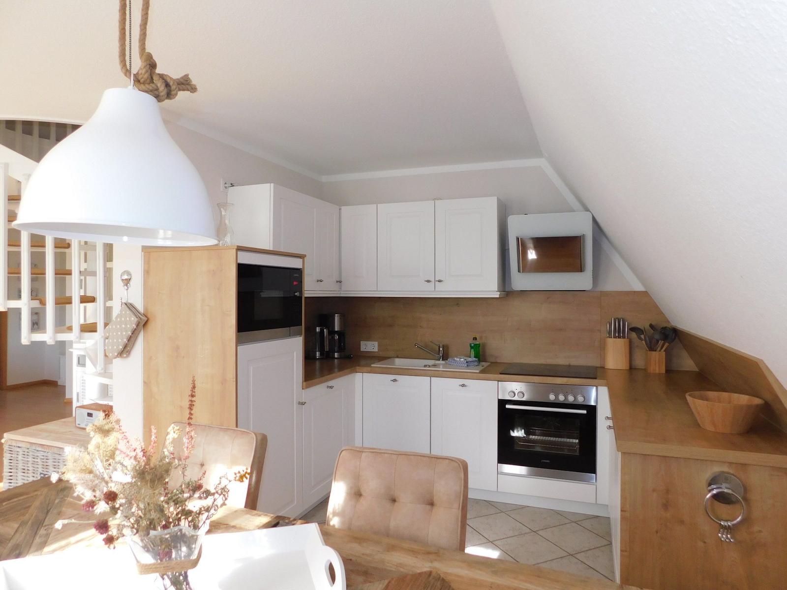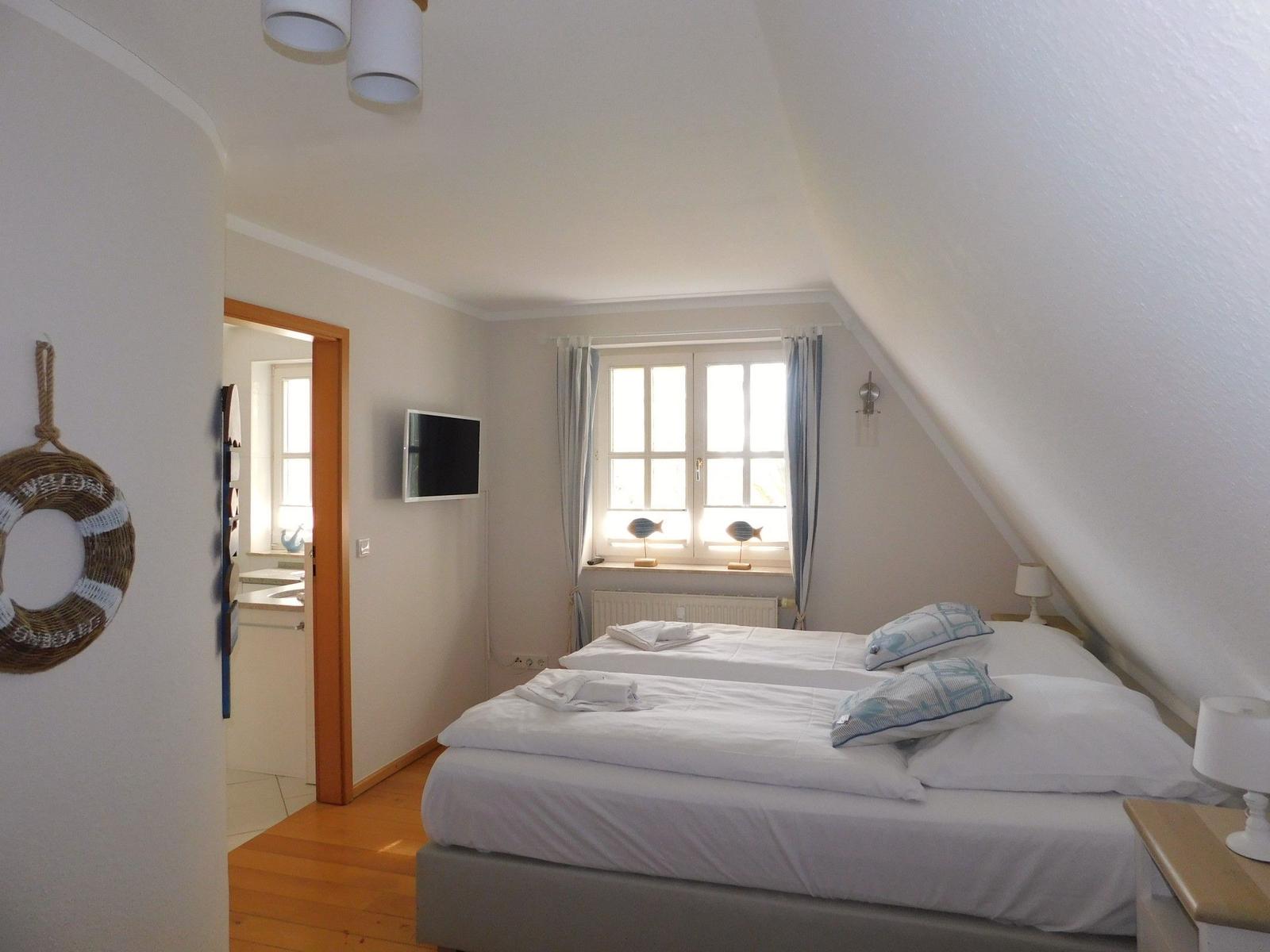 Diese stilvolle Ferienwohnung bietet einen komfortablen Rückzugsort für jeden Gast. Sie verfügt über ein Schlafzimmer mit einem Doppelbett sowie ein Wohnschlafzimmer mit Einzelbetten, wodurch die Unterkunft ideal für Paare oder kleinere Familien geeignet ist. Die offene Küche ist modern ausgestattet und umfasst einen Geschirrspüler, Elektro- und Gasherd, Backofen, Mikrowelle, Kühlschrank sowie eine Kaffeemaschine und einen Toaster. Allergikerfreundliche Elemente und Fliegengitter sorgen für ein angenehmes Raumklima.