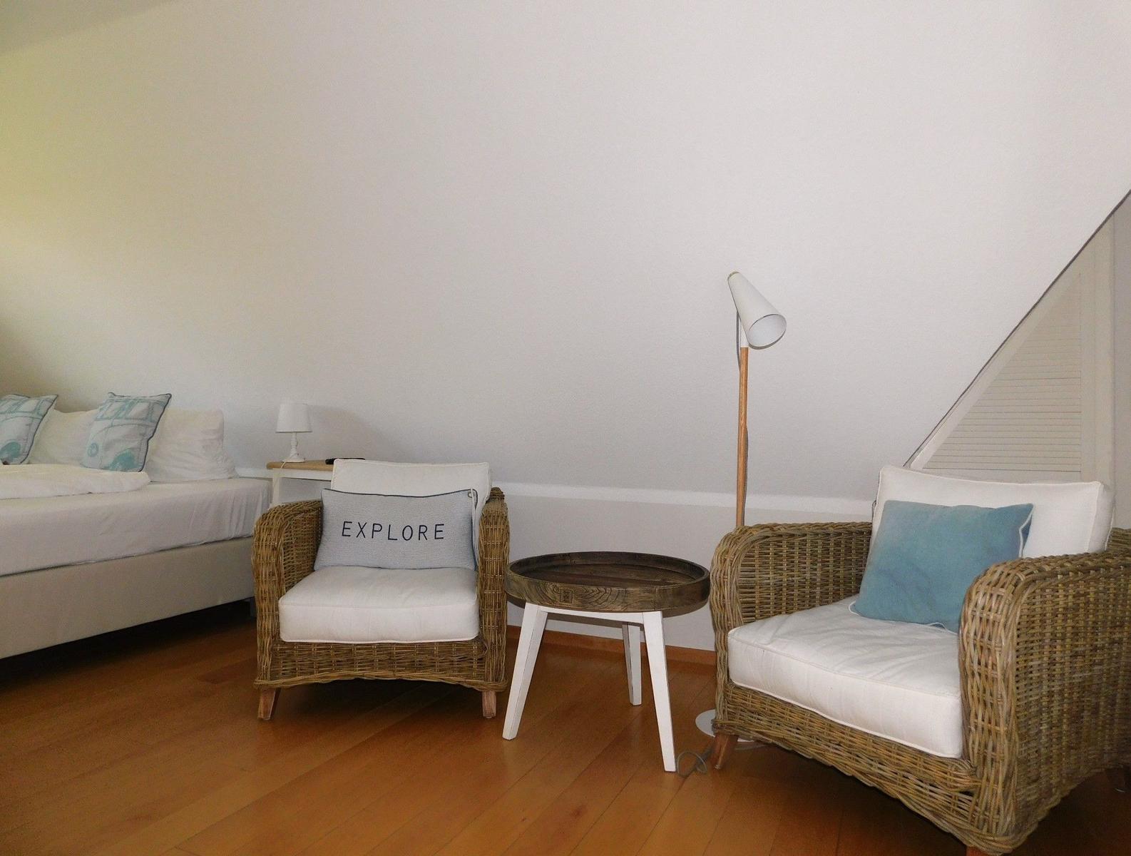 Das Badezimmer überzeugt mit einem Fenster, einer Badewanne und einem separaten Duschbad, während das Gäste-WC zusätzlichen Komfort bietet. Eine HiFi-Anlage, DVD-/Blu-Ray-Player und TV sorgen für Unterhaltung. Zudem ist die Wohnung mit WLAN, einem Parkplatz, einer Waschmaschine und weiteren Annehmlichkeiten ausgestattet, um den Aufenthalt so angenehm wie möglich zu gestalten. Gartenmöbel und ein Sonnenschirm stehen bereit, um die sonnigen Tage im Freien zu genießen.