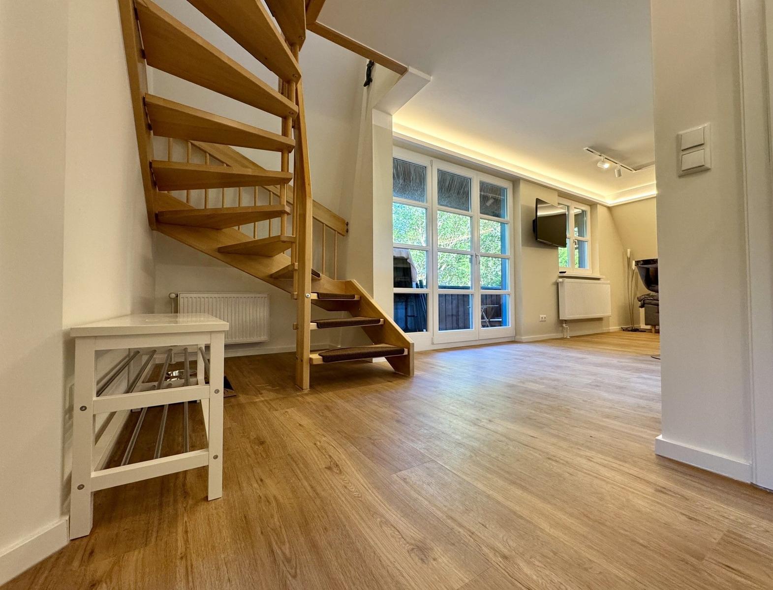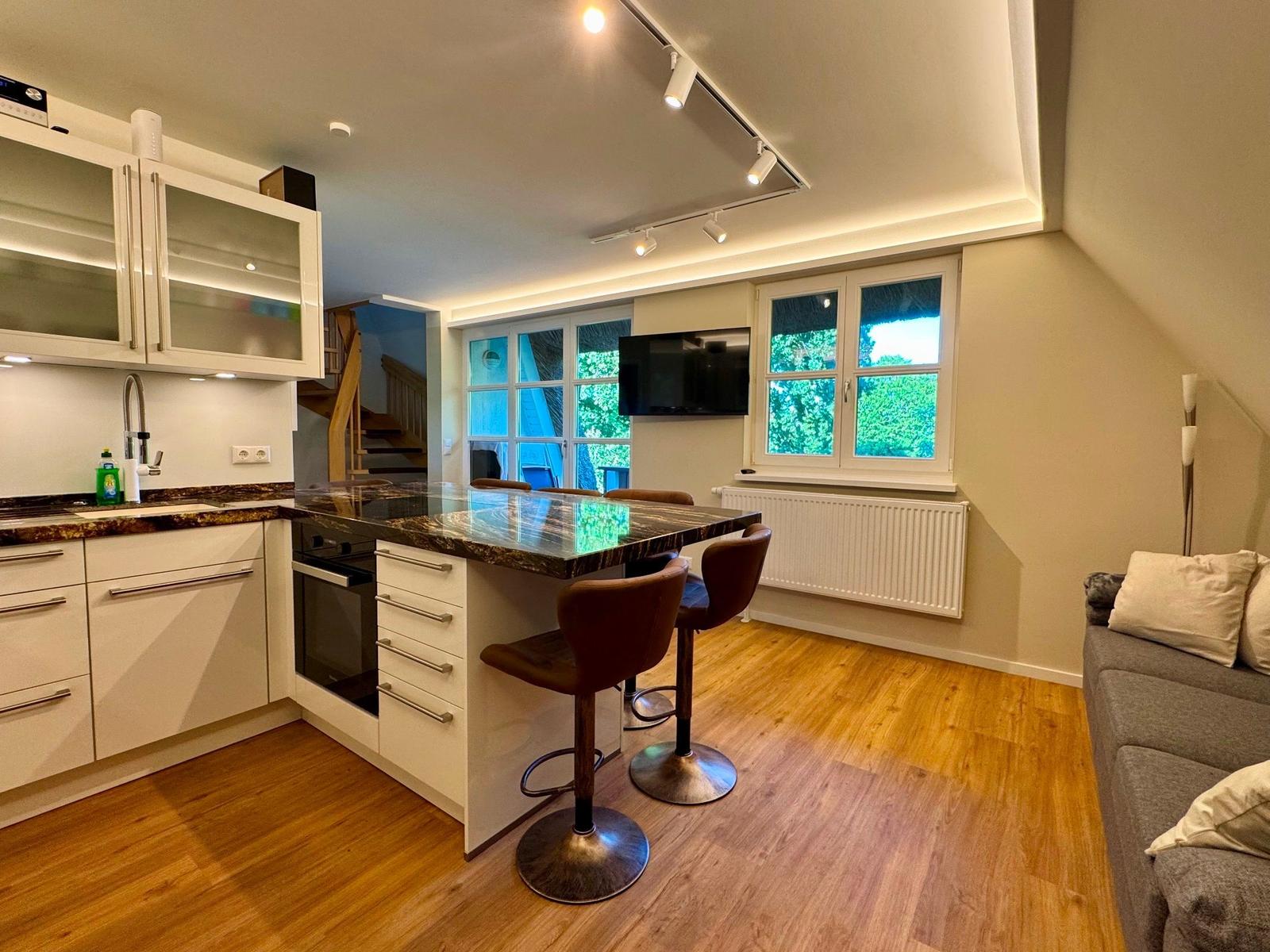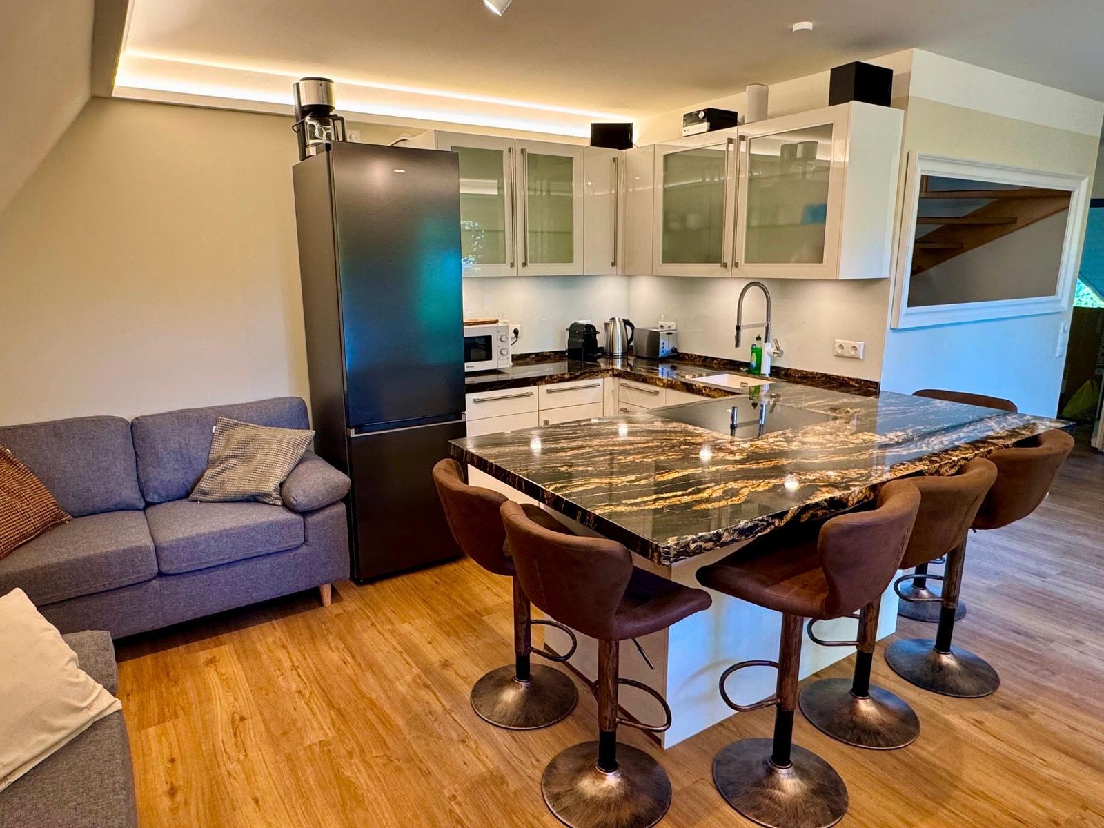 Die Ferienwohnung bietet eine komfortable Unterkunft für bis zu sieben Personen. Sie verfügt über drei helle Schlafzimmer, ausgestattet mit zwei Doppelbetten und einem Einzelbett. Die offene Küche lädt mit modernen Geräten wie Geschirrspüler, Elektro-/Gasherd, Backofen, Mikrowelle und Kühlschrank zum Kochen ein. Eine Kaffeemaschine, Espressomaschine sowie ein Toaster sind ebenfalls vorhanden.