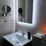 Modernes Bad mit bodennaher Regendusche, WC mit Spartaste, beleuchtetem Spiegel, Kosmetikspiegel, Haartrockner, Hotel-Duschgel & -Seife, Kosmetikeimer, Hand- & Duschtücher, Zahnputzbecher, Toilettenpapier und Badvorleger.
