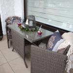 Gemütlich eingerichtet mit King-Size-Bett (1,80 m × 2,00 m, offenes Fußende), Sofa mit Couchtisch, Essbereich mit Tisch und Stühlen, 55-Zoll-Smart-TV (Netflix), Highboard und Kleiderschrank. Elektrische Außenrollläden und eine Balkontür mit Fliegengitter sorgen für zusätzlichen Komfort.