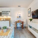 Die Ferienwohnung bietet eine komfortable und gut ausgestattete Unterkunft für entspannte Aufenthalte. Sie verfügt über ein Schlafzimmer mit einem gemütlichen Doppelbett sowie ein modernes Badezimmer mit einer bodengleichen Dusche, Haartrockner und Kosmetikspiegel. Die offene Küche ist mit einem Elektro-/Gasherd, Geschirrspüler, Mikrowelle, Kühlschrank, Kaffeemaschine, Toaster und Gefriermöglichkeit ausgestattet, sodass kulinarische Wünsche erfüllt werden können. Das stilvoll eingerichtete Wohnbereich mit Sofa und Sessel lädt zum Entspannen ein und bietet Unterhaltung durch einen Fernseher, DVD-/Blu Ray-Player und eine HiFi-Anlage. WLAN-Internet ist selbstverständlich vorhanden. Die Wohnung ist allergikergeeignet und bietet zudem praktische Annehmlichkeiten wie Waschmaschine, Wäschetrockner und Staubsauger. Ein Parkplatz sowie Zugang zu einem Fahrstuhl und einem gemeinschaftlichen Fitnessraum runden das Angebot ab. Rauchmelder garantieren zusätzliche Sicherheit.