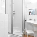 Das Badezimmer ist mit einer Dusche, Haartrockner sowie einem Kosmetikspiegel ausgestattet. Zur weiteren Einrichtung gehören ein TV, Sofa, Sessel und Spiegel.
