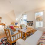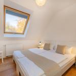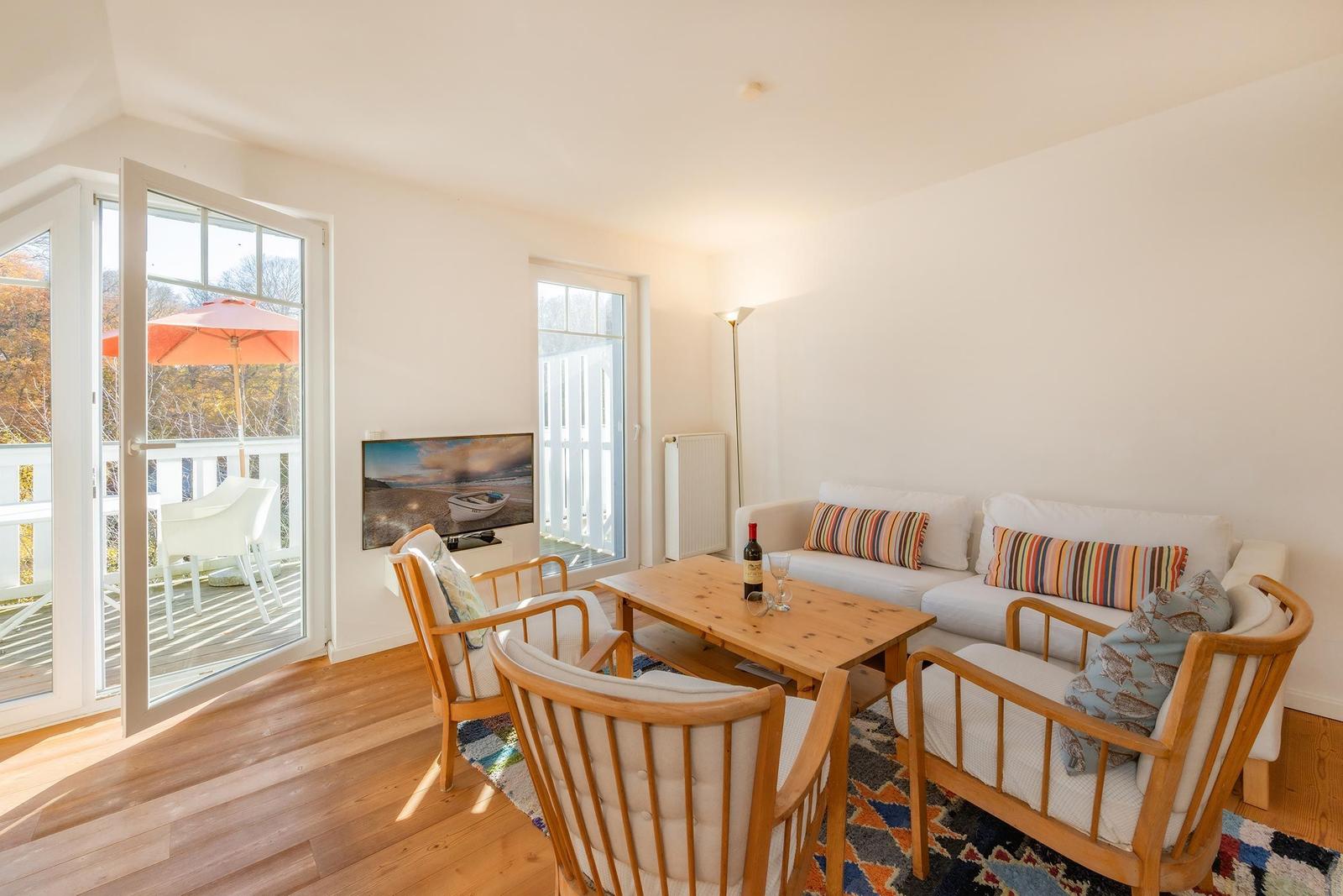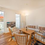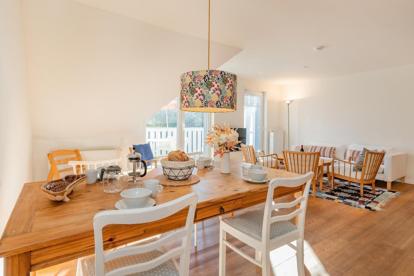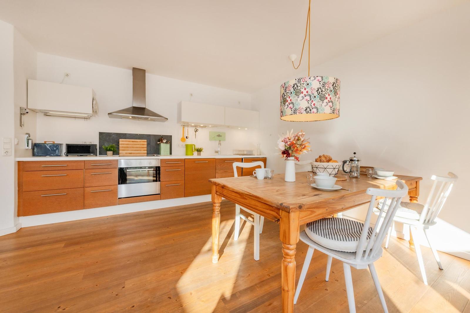 Die Ferienwohnung Haus Auguste 17 im Ostseebad Bansin bietet auf 76 Quadratmetern eine elegante und gemütliche Gestaltung. In der zweiten Etage gelegen, besticht sie durch einen offenen Wohnbereich mit komfortabler Couch und Flat-TV, sowie eine modern eingerichtete Küche mit Ceranherd, Spülmaschine und French Press. Der stilvolle Esstisch schafft Platz für gemeinsame Mahlzeiten. Das Hauptschlafzimmer verfügt über ein Doppelbett (1,80 m x 2,00 m) und einen großen Kleiderschrank, während das zweite Schlafzimmer zwei Einzelbetten, einen Schreibtisch und ein Sofa bietet. Das helle Bad ist mit Dusche und Waschmaschine ausgestattet. Für Familien stehen Babyreisenbett, Hochstuhl und Kinderbesteck bereit. Die Wohnung bietet kostenfreies WLAN und einen abschließbaren Fahrradraum, sowie einen PKW-Stellplatz. Ein perfekter Rückzugsort für entspannte Urlaubstage an der Ostsee.