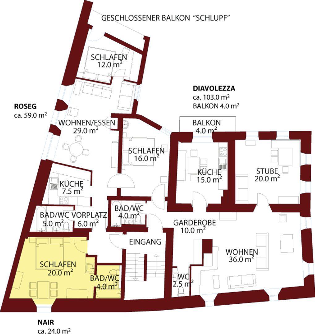 Das Studio Nair bietet auf 24 m² alles, was man für einen komfortablen Aufenthalt im Engadin benötigt. Der gemütliche Wohn- und Schlafraum ist mit zwei bequemen Einzelbetten, einem Esstisch und stilvollen Arvenmöbeln eingerichtet, die dem Raum eine warme und einladende Atmosphäre verleihen. Die praktische Schrankküche ist mit Kochplatten, Toaster, Kühlschrank, Nespresso-Maschine und Geschirr ausgestattet – ideal zur Zubereitung kleiner Mahlzeiten. Im Badezimmer befinden sich eine Badewanne mit Duschvorrichtung, WC, Waschbecken und Haartrockner. Für modernen Komfort sorgen WLAN, ein Flachbild-TV mit Netflix, eine Stereoanlage sowie Bodenheizung. Das Studio eignet sich perfekt für ein bis zwei Personen, die Ruhe, Gemütlichkeit und den authentischen Engadiner Charme schätzen.
