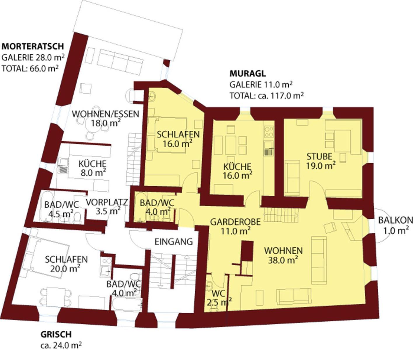 Die Wohnung Muragl bietet auf grosszügigen 117 m² und zwei Ebenen ein stilvolles Wohnerlebnis im traditionellen Engadiner Stil. Das Wohnzimmer mit Cheminée, Ledersofas und antiken Möbeln lädt zu gemütlichen Stunden ein, während die angrenzende Engadinerstube mit Esstisch, Eckbank und zusätzlichem Sofa eine warme, heimelige Atmosphäre schafft. Die historische Gewölbeküche ist vollständig ausgestattet – mit Kochherd, Backofen, Geschirrspüler, Kühlschrank, Nespresso-Maschine, Wasserkocher und Toaster. Auf der Galerie befinden sich zwei weitere Betten, ideal für Familien oder Freunde. Das Badezimmer mit Badewanne und das separate WC sorgen für zusätzlichen Komfort. WLAN, ein Flachbild-TV mit Netflix und Bodenheizung bieten moderne Annehmlichkeiten, während das Haus selbst Geschichte und Engadiner Charme atmet. Perfekt für bis zu sechs Personen, die Raum, Authentizität und alpine Gemütlichkeit schätzen.