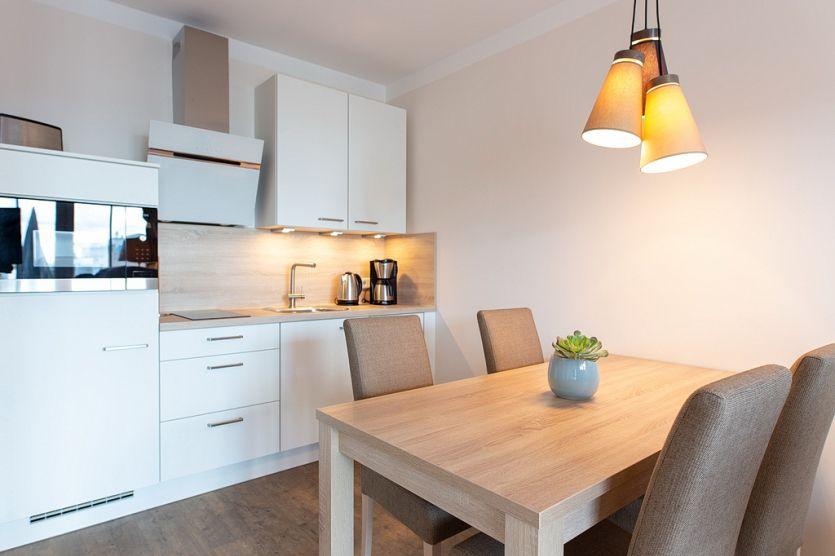 Die offene Küche mit integriertem Essbereich besitzt einen Geschirrspüler, Gefrierfach, Toaster, Kaffeemaschine, Mikrowelle, 2-Platten-Ceranfeld und Wasserkocher.