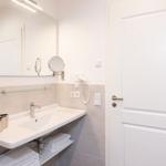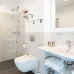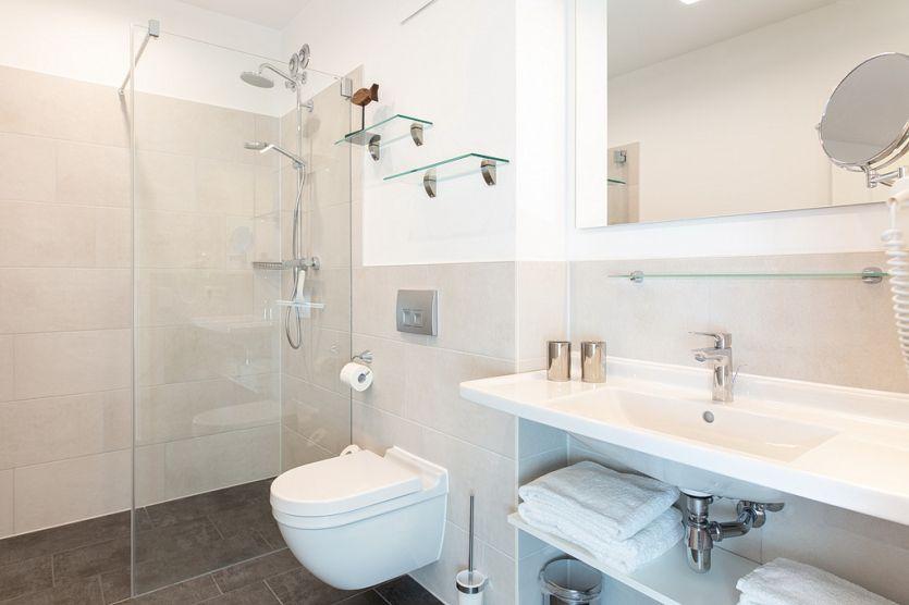 Die offene Regendusche ist das Highlight des Badezimmers und ausgestattet mit einem Handtuchwärmer, einem Waschtisch mit Kosmetikspiegel und einem Haartrockner.