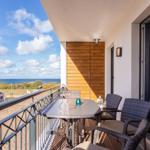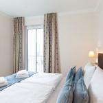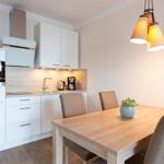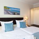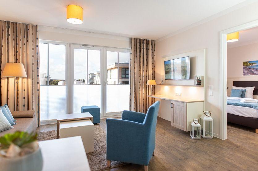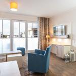 Die exklusive Ferienwohnung befindet sich in westlicher Lage in der 2. Etage des Aparthotels und bietet auf 49 m² viel Platz für bis zu 4 Personen. Der gemütliche Wohnbereich besitzt ein bequemes Sofa, welches sich mit wenigen Handgriffen zu einer Doppelschlafcouch (1,40m x 2,00m) umfunktionieren lässt, und sorgt mit einem Flatscreen-TV für reichlich Entertainment.
