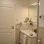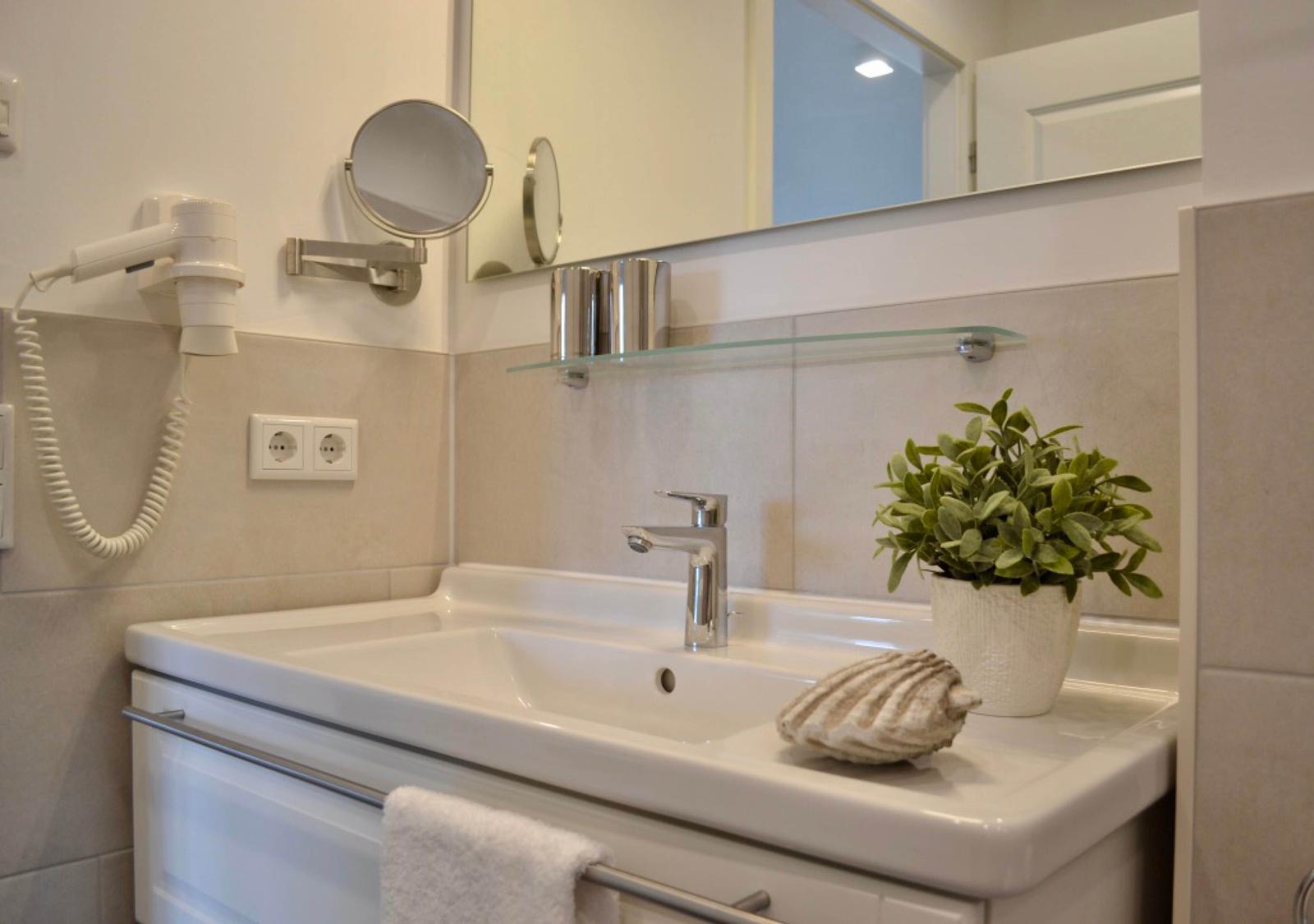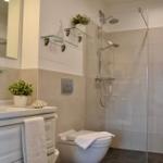 Die offene Regendusche ist das Highlight des Badezimmers und ausgestattet mit einem Handtuchwärmer, einem Waschtisch mit Kosmetikspiegel und einem Haartrockner.