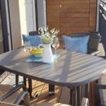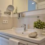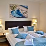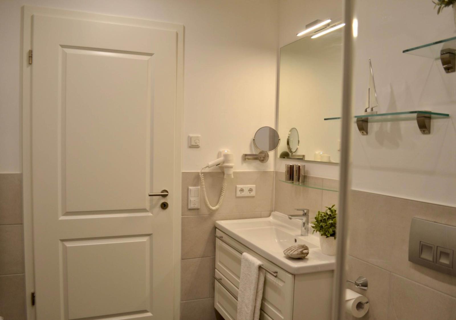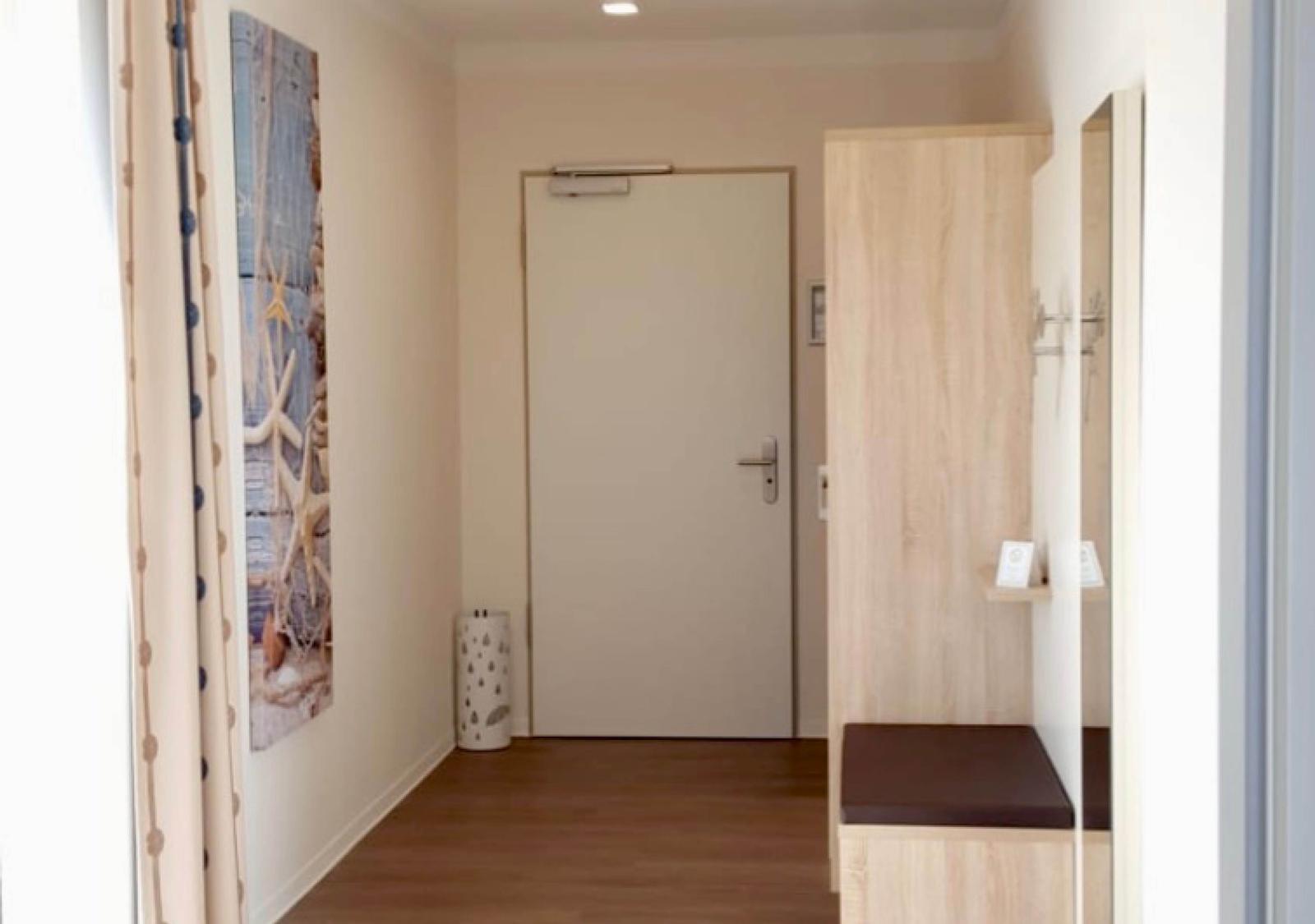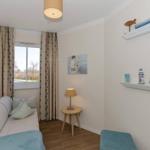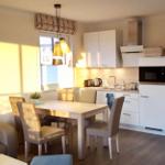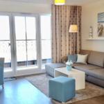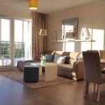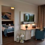 Die exklusive lichtdurchflutete Ferienwohnung befindet sich im östlichen Flügel im Erdgeschoss des Aparthotels und bietet auf 68m² viel Platz für bis zu 5 Personen. Der gemütliche Wohnbereich mit großen Fenstern zur Meerseite besitzt ein bequemes Eck-Sofa, welches sich mit wenigen Handgriffen zu einer Doppelschlafcouch (1,50m x 2,00m) umfunktionieren lässt, und sorgt mit einem Flatscreen-TV für reichlich Entertainment.