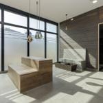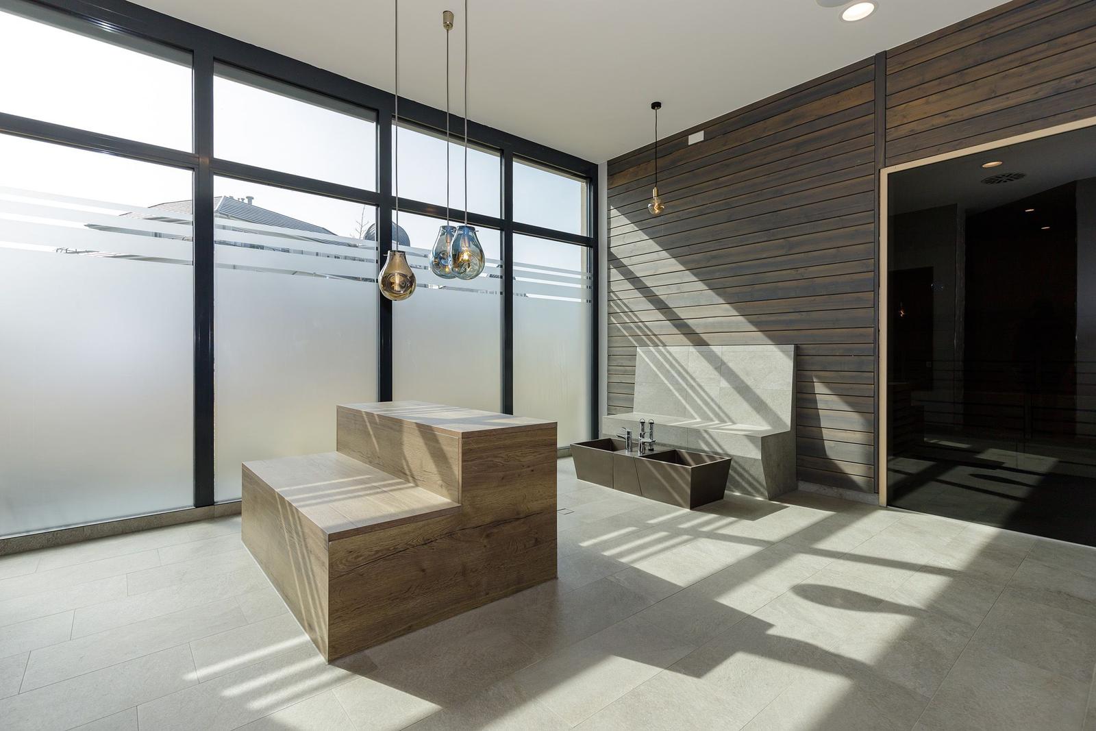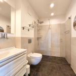 Im geräumigen Bad befinden sich eine großzügige, ebenerdige Regendusche, ein Handtuchtrockner, ein Waschtisch mit Föhn und Kosmetikspiegel.