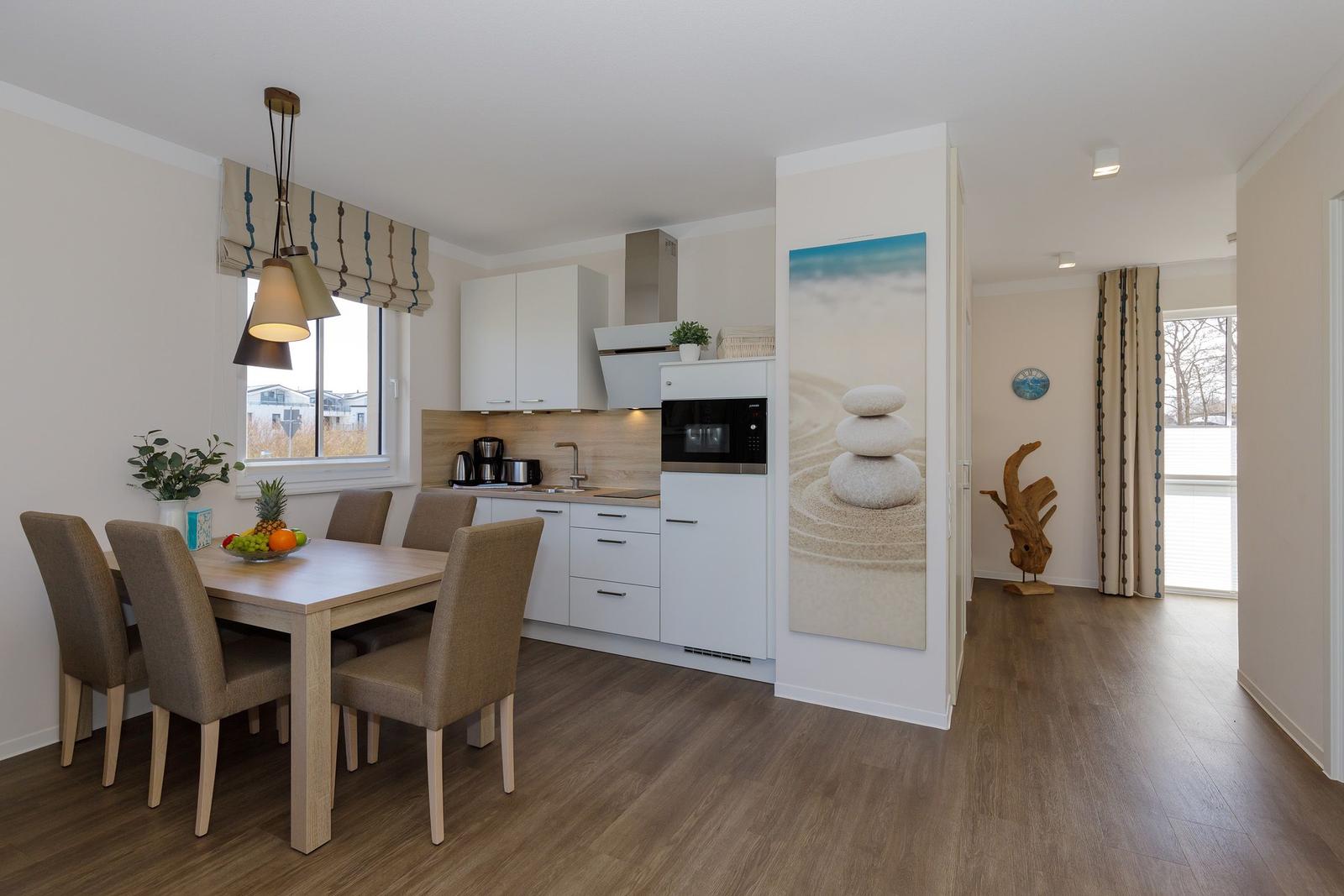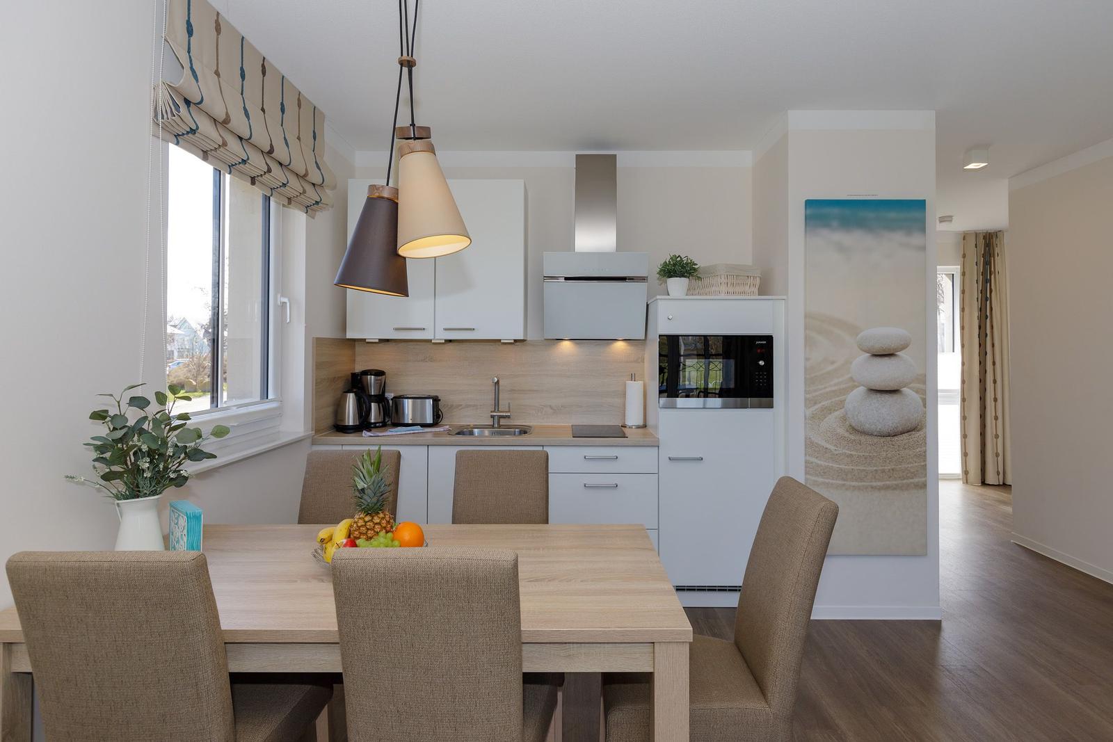 Im kombinierten Wohn-Essbereich befindet sich eine voll ausgestattete Küchenzeile, bequeme Sitzmöbel, ein Esstisch, eine Schlafcouch (150cm x 200cm) sowie ein Flat Screen-TV.