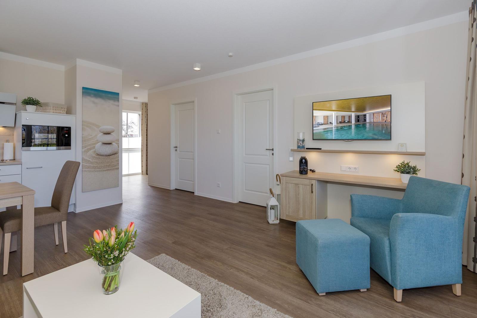 Die 68 m² große 3-Zimmer Suite ist für max. 5 Personen geeignet und befindet sich in nordöstlicher Lage mit Blick auf die Strandpromenade.