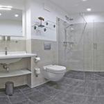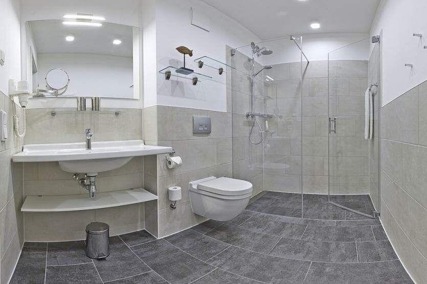 Die offene Regendusche ist das Highlight des Badezimmers und ausgestattet mit einem Handtuchwärmer, einem Waschtisch mit Kosmetikspiegel und einem Haartrockner.