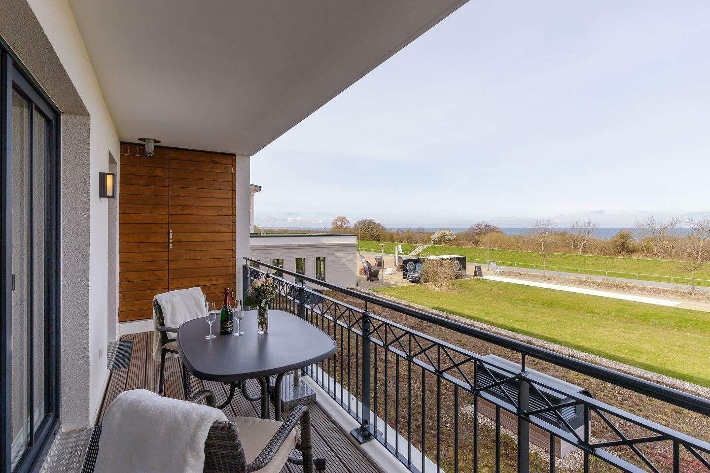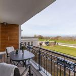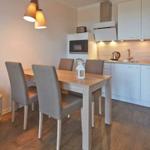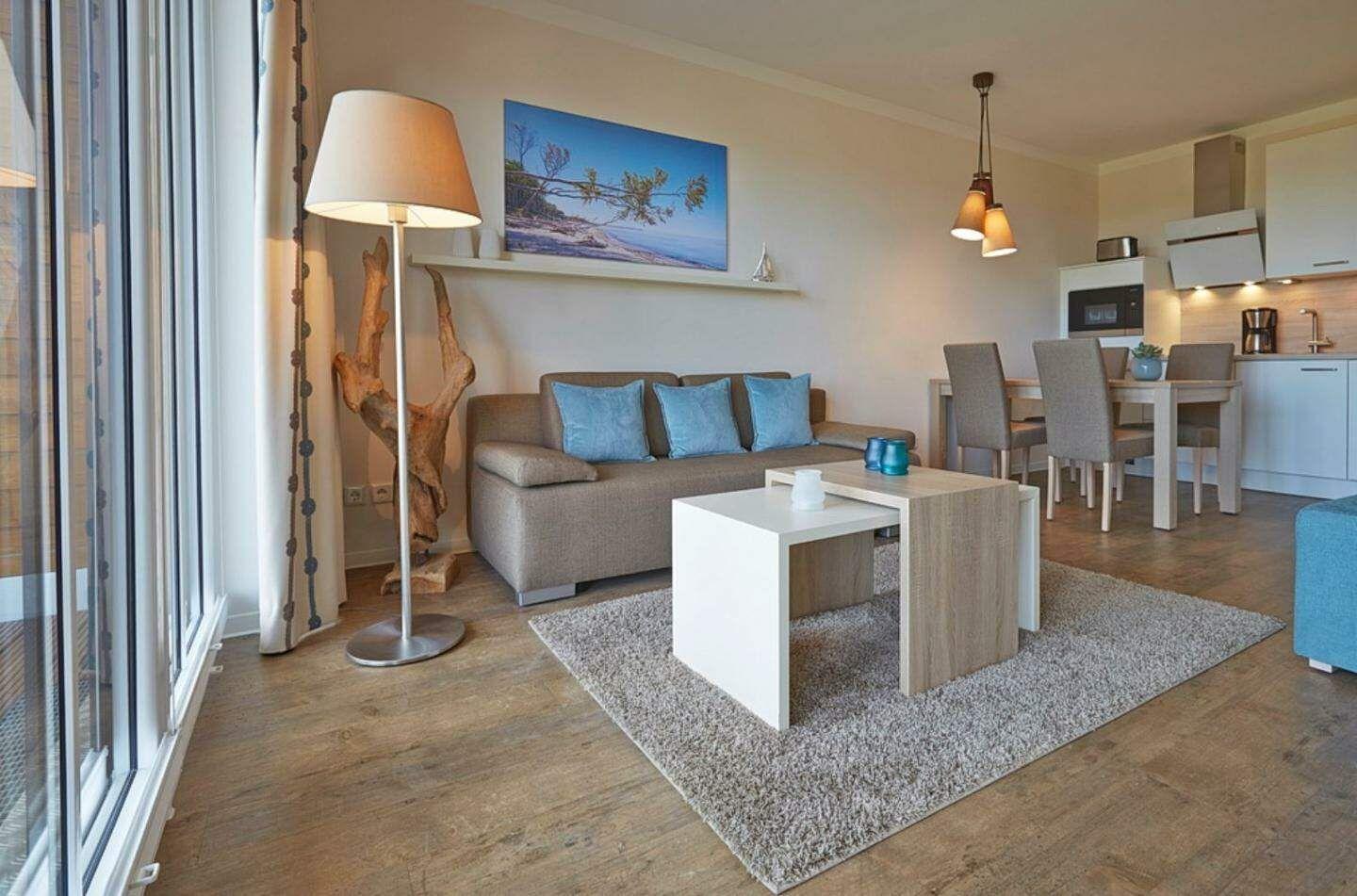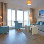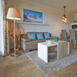 Die exklusive Ferienwohnung befindet sich in der 1. Etage des Aparthotels und bietet auf 49 m² viel Platz für bis zu 4 Personen. Der gemütliche Wohnbereich besitzt ein bequemes Sofa, welches sich mit wenigen Handgriffen zu einer Doppelschlafcouch (1,40m x 2,00m) umfunktionieren lässt, und sorgt mit einem Flatscreen-TV für reichlich Entertainment.