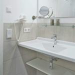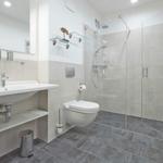 Die offene Regendusche ist das Highlight der Wohnung. Das Badezimmer ist ausgestattet mit einem Handtuchwärmer, einem Waschtisch mit Kosmetikspiegel und einem Haartrockner.