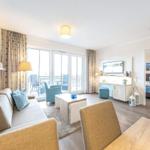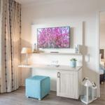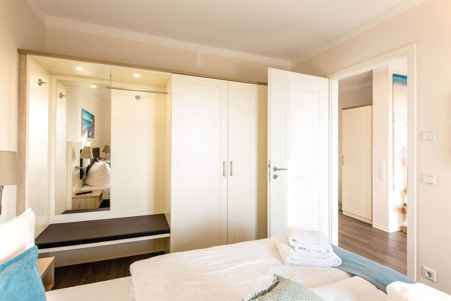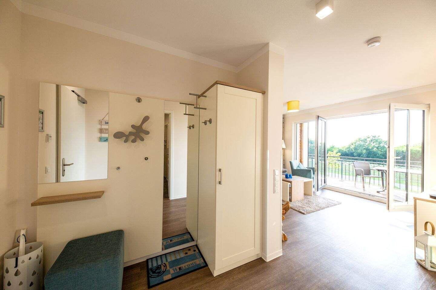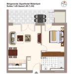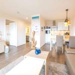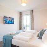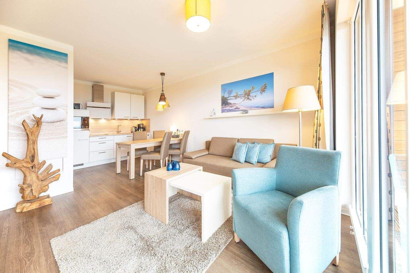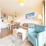 Das 49 m² Zwei-Zimmer-Nichtraucher-Apartment 1-29 ist für bis zu 3 Erwachsene und einem Kleinkind bis 3 Jahren ausgestattet. Der gemütliche Wohnbereich dieser Ferienwohnung besitzt ein bequemes Sofa, welches sich mit wenigen Handgriffen zu einer Schlafcouch (1,40m x 2,00m) umfunktionieren lässt. Hier kann ein Erwachsener bequem schlafen. Der Flatscreen-TV sorgt zusätzlich zum Ausblick für reichlich Entertainment.