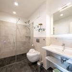 Die offene Regendusche ist das Highlight des Badezimmers und ausgestattet mit einem Handtuchwärmer, einem Waschtisch mit Kosmetikspiegel und einem Haartrockner.