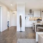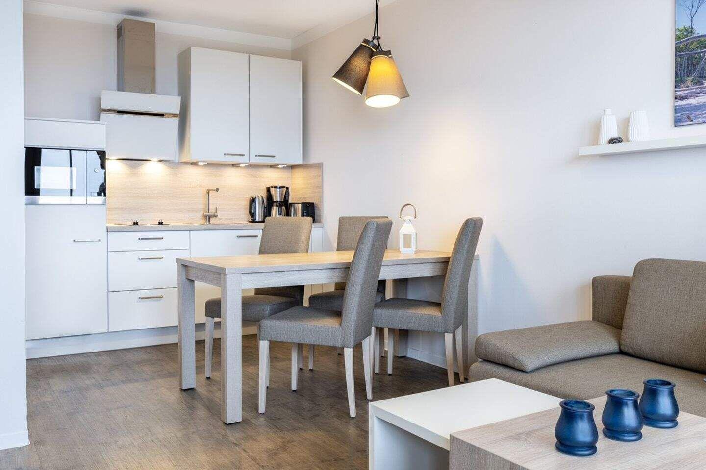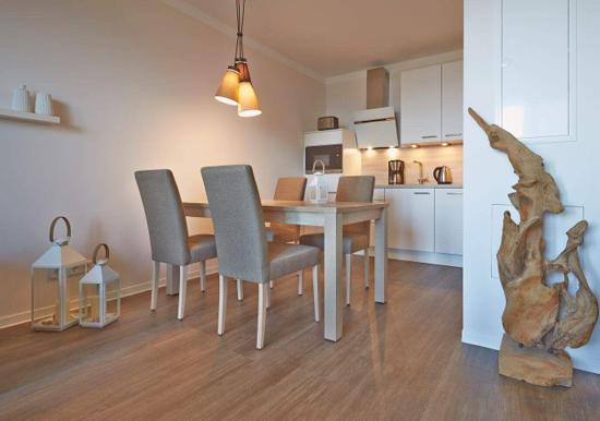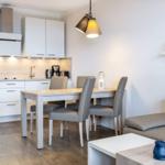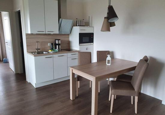 Die offene Küche mit integriertem Essbereich besitzt einen Geschirrspüler, Gefrierfach, Toaster, Kaffeemaschine, Mikrowelle, 2-Platten-Ceranfeld und Wasserkocher.