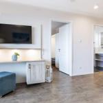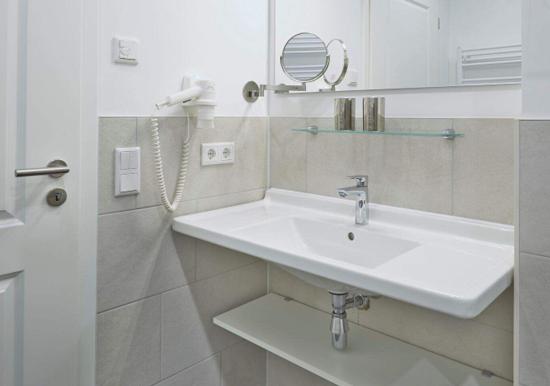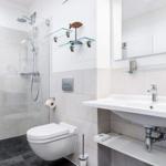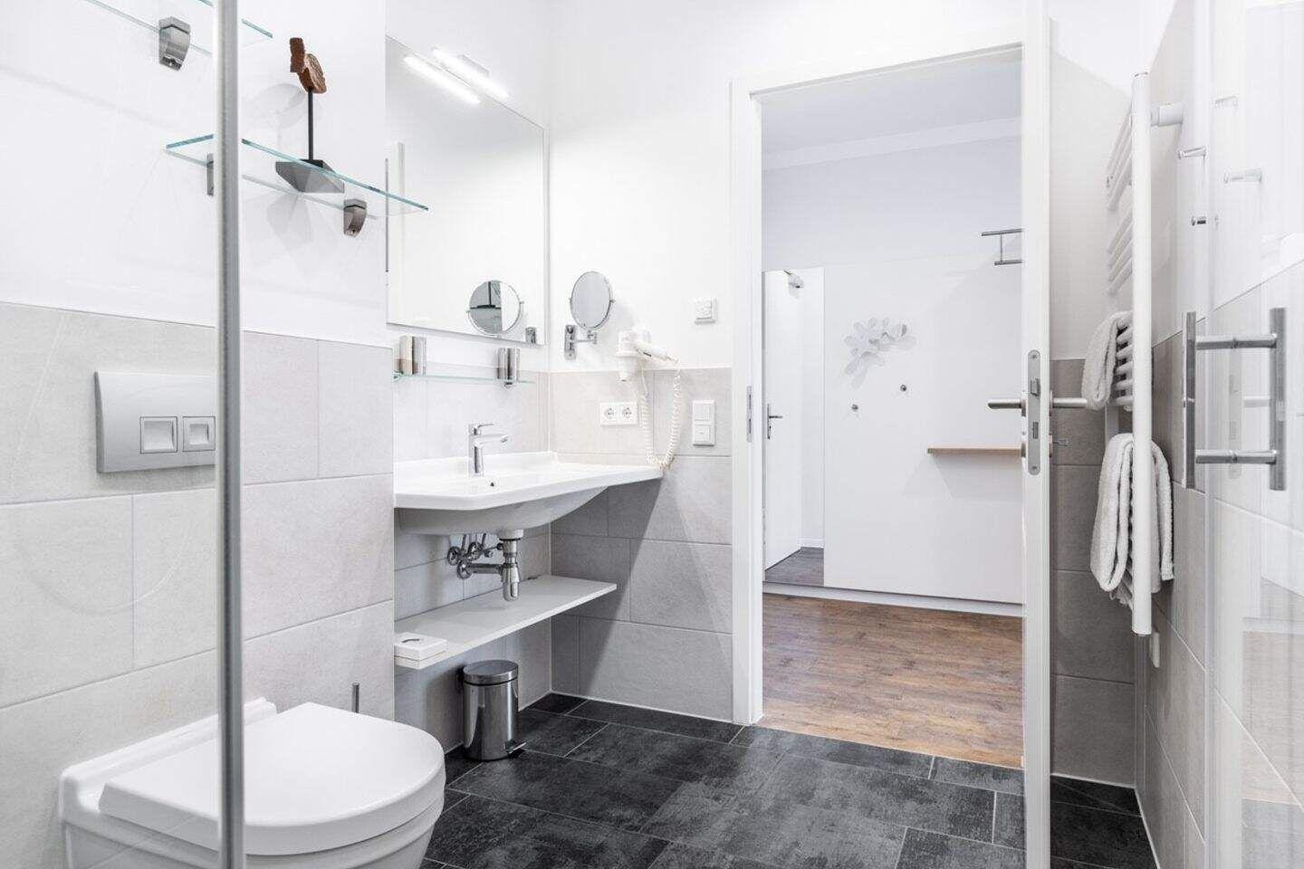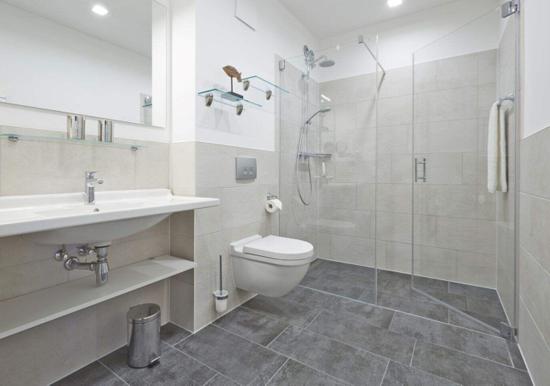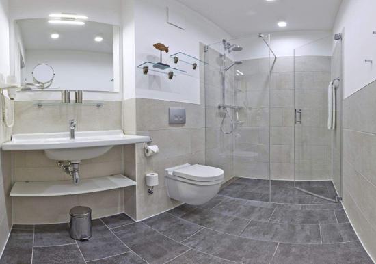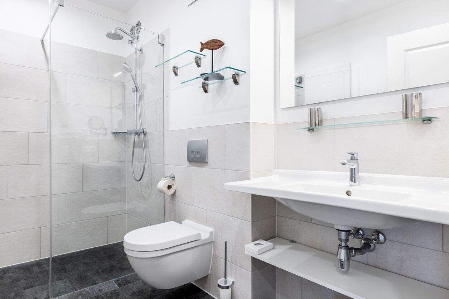 Die offene Regendusche ist das Highlight des Badezimmers. Es ist weiterhin ausgestattet mit einem Handtuchwärmer, einem Waschtisch mit Kosmetikspiegel und einem Haartrockner.