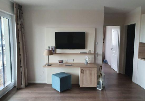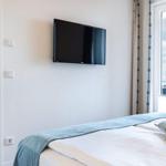 Das Schlafzimmer bietet ein modernes Boxspringbett (1,80m x 2,10m), auf welchem Sie süße Träume haben werden. Auch im Schlafzimmer gibt es einen Flatscreen-TV zu Ihrem Entertainment. Ein Kinderbett sowie ein Hochstuhl können auf Anfrage hinzugebucht werden.