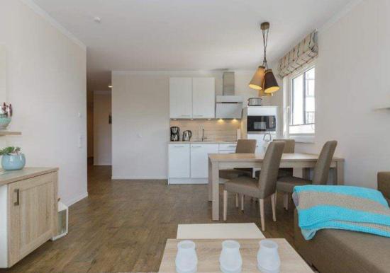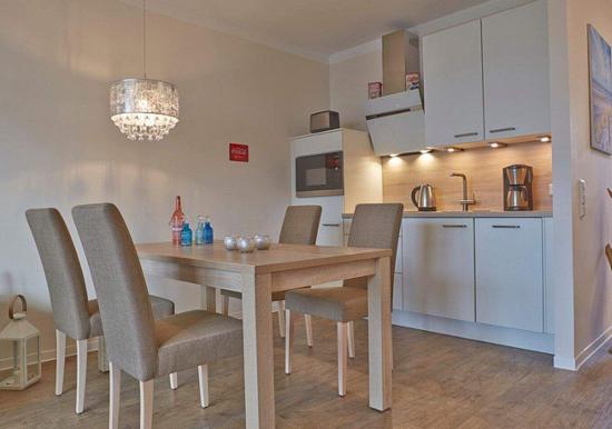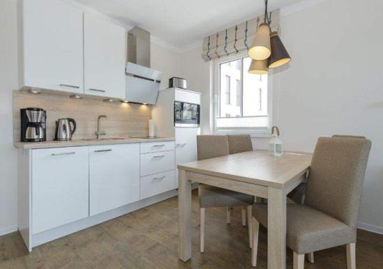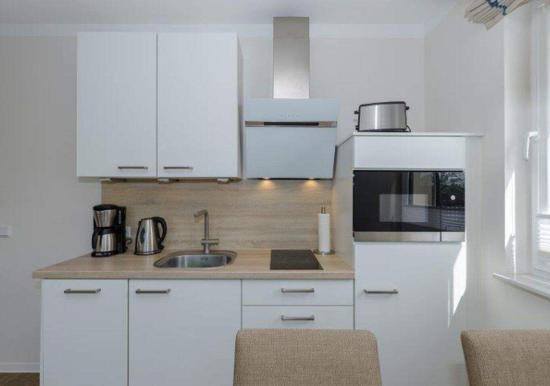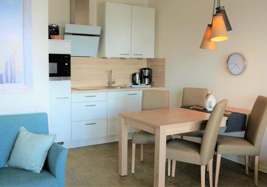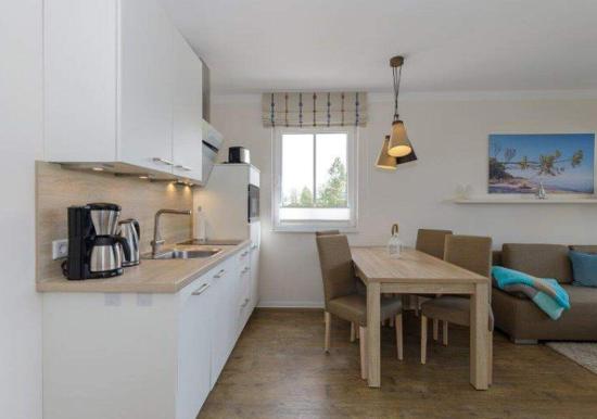 Die offene Küche mit integriertem Essbereich besitzt einen Geschirrspüler, Gefrierfach, Toaster, Kaffeemaschine, Mikrowelle, 2-Platten-Ceranfeld und Wasserkocher.
